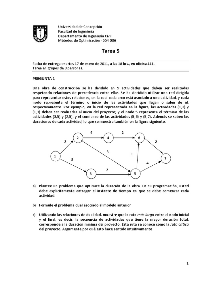 a6 3lantee un pro-lema /ue optimice la duracin de la o-ra* 9n su programacin( usted de-e e:plcitamente entregar el instante de tiempo en /ue se de-e comenzar cada actividad* -6 Formule el pro-lema dual asociado al modelo anterior c6 Utilizando las relaciones de dualidad( muestre /ue la ruta ms larga entre el nodo inicial 2 el +inal( es decir( la secuencia de actividades /ue tiene la ma2or duracin total( corresponde a la duracin mnima del pro2ecto* 9sta ruta se conoce como la ruta crtica del pro2ecto* 8rgumente por /u esto $ace sentido intuitivamente