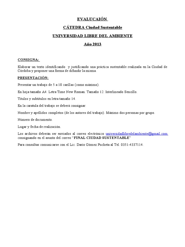 C"NSI#NA$ Elaborar un texto identificando y justificando una prctica sustentable realizada en la Ciudad de Crdoba y proponer una forma de difundir la misma. %RESENTACIN$ Presentar un trabajo de 5 a 10 carillas (como mximo . En !oja tama"o #$. %etra &ime 'e( )oman. &ama"o 1*. +nterlineado ,encillo. &-tulos y subt-tulos en letra tama"o 1$. En la caratula del trabajo se deber [Link]/ 'ombre y apellidos completos (de los autores del trabajo . 0ximo dos personas por .rupo. '1mero de documento. %[Link] y fec!a de realizacin. %os arc!i2os debern ser en2iados al correo electrnico [Link] [Link] en el asunto del correo 4&INAL CIUDAD SUSTENTABLE5 Para consultas comunicarse con el %ic. 6ar-o 7mez Puc!eta al &el. 08519$88:11$.