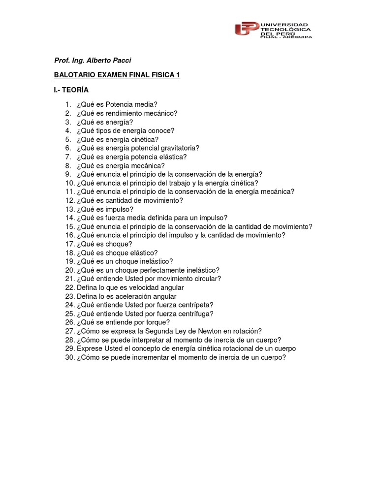 Prof. Ing. Alberto Pacci BALOTARIO EXAMEN FINAL FISICA 1 I.- TEORA 1. Qu es Potencia media? 2. Qu es rendimiento mecnico? 3. Qu es energa? 4. Qu tipos de energa conoce? 5. Qu es energa cintica? 6. Qu es energa potencial gravitatoria? 7. Qu es energa potencia elstica? 8. Qu es energa mecnica? 9. Qu enuncia el principio de la conservacin de la energa? 10. Qu enuncia el principio del trabajo y la energa cintica? 11. Qu enuncia el principio de la conservacin de la energa mecnica? 12. Qu es cantidad de movimiento? 13. Qu es impulso? 14. Qu es fuerza media definida para un impulso? 15. Qu enuncia el principio de la conservacin de la cantidad de movimiento? 16. Qu enuncia el principio del impulso y la cantidad de movimiento? 17. Qu es choque? 18. Qu es choque elstico? 19. Qu es un choque inelstico? 20. Qu es un choque perfectamente inelstico? 21. Qu entiende Usted por movimiento circular? 22. Defina lo que es velocidad angular 23. Defina lo es aceleracin angular 24. Qu entiende Usted por fuerza centrpeta? 25. Qu entiende Usted por fuerza centrfuga? 26. Qu se entiende por torque? 27. Cmo se expresa la Segunda Ley de Newton en rotacin? 28. Cmo se puede interpretar al momento de inercia de un cuerpo? 29. Exprese Usted el concepto de energa cintica rotacional de un cuerpo 30. Cmo se puede incrementar el momento de inercia de un cuerpo?