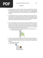16. Un piloto de avin bien entrenado aguanta aceleraciones de hasta 8 veces la de la gravedad, durante tiempos breves, sin perder el conocimiento. Para un avin que vuela a 2300 km/h, cul ser el radio de giro mnimo que puede soportar? Respuesta: r = 5200 m 17. La Estacin Espacial Internacional gira con velocidad angular constante alrededor de la Tierra cada 90 minutos en una rbita a 300 km de altura sobre la superficie terrestre (por tanto, el radio de la rbita es de 6670 km). a) Calcular la velocidad angular Resultado: = /2700 rad/s b) Calcular la velocidad tangencial o lineal v Resultado: v = 7760 m/s c) Tiene aceleracin? En caso afirmativo, indicar sus caractersticas y, en caso negativo, explicar las razones de que no exista. 18. El rotor de un girscopo tiene un momento de inercia de 2500 g.cm2. Alrededor su eje de 0,5 m de dimetro, se enrolla una cuerda de 1 m de longitud. Si se tira de ella con una fuerza constante y el rotor alcana una velocidad angular de w= 750 rad/s cuando la cuerda se desenrolla completamente. Hallar: a) La aceleracin angular Rpta: 703,13 rad/s2 b) La fuerza constante de traccin Rpta: 7 031 300 din= 70,3 N 19. Una piedra de afilar consiste en un disco cilndrico de 0,30 m de radio y 36,0 kg de masa. Encontrar: a) Su momento de inercia (Io = m r2 ) Rpta: 1,62 kg.m2 b) El momento de fuerza externo constante que se requiere para acelerar la piedra desde el reposo hasta una velocidad angular de 1800 rpm en un intervalo de tiempo de 5,0 s, suponiendo que en los apoyos no hay friccin Rpta: 61,07 N.m 20. Un automvil que viaja sobre un camino recto a 9 m/seg pasa sobre un montecillo en el camino. El montculo puede considerarse como un arco de un crculo de 11 metros de radio. a) Cual es el peso aparente de una mujer de 600 N en el carro cuando pasa sobre el montecillo? Rpta: 149,19 N b) Cual debe ser la rapidez del carro sobre el montecillo si ella no tiene peso en ese momento? (Es decir, su peso aparente es cero) Rpta: 10,38 m/s