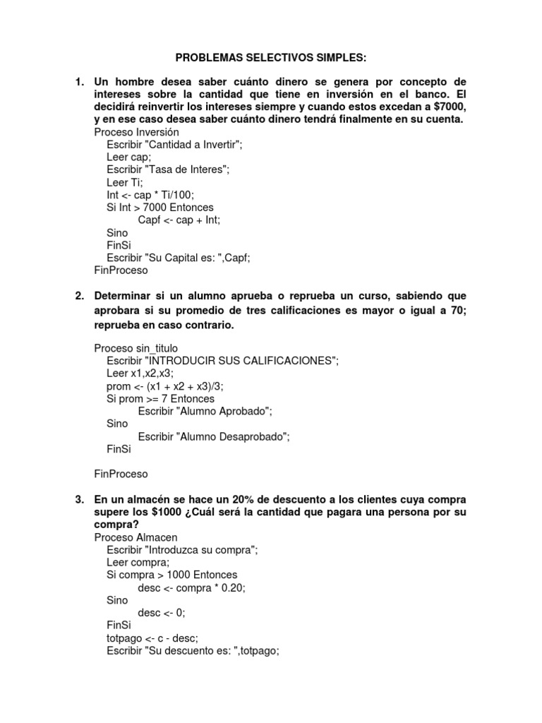 Un hombre desea saber cunto dinero se genera por concepto de intereses sobre la cantidad que tiene en inversin en el banco. El decidir reinvertir los intereses siempre y cuando estos excedan a $7000, y en ese caso desea saber cunto dinero tendr finalmente en su cuenta. Proceso Inversin Escribir "Cantidad a Invertir"; Leer cap; Escribir "Tasa de Interes"; Leer Ti; Int <- cap * Ti/100; Si Int > 7000 Entonces Capf <- cap + Int; Sino FinSi Escribir "Su Capital es: ",Capf; FinProceso 2. Determinar si un alumno aprueba o reprueba un curso, sabiendo que aprobara si su promedio de tres calificaciones es mayor o igual a 70; reprueba en caso contrario. Proceso sin_titulo Escribir "INTRODUCIR SUS CALIFICACIONES"; Leer x1,x2,x3; prom <- (x1 + x2 + x3)/3; Si prom >= 7 Entonces Escribir "Alumno Aprobado"; Sino Escribir "Alumno Desaprobado"; FinSi FinProceso 3. En un almacn se hace un 20% de descuento a los clientes cuya compra supere los $1000 Cul ser la cantidad que pagara una persona por su compra? Proceso Almacen Escribir "Introduzca su compra"; Leer compra; Si compra > 1000 Entonces desc <- compra * 0.20; Sino desc <- 0; FinSi totpago <- c - desc; Escribir "Su descuento es: ",totpago;