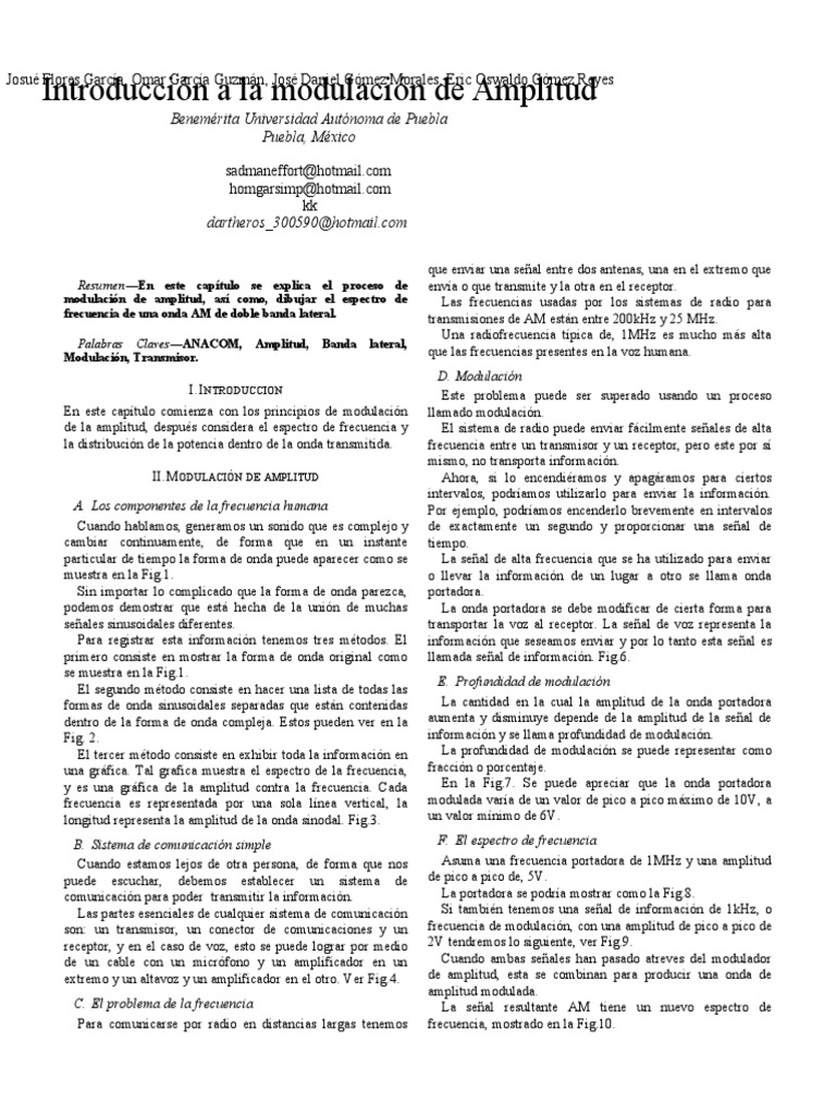 Resumen En este captulo se explica el proceso de modulacin de amplitud, as como, dibujar el espectro de frecuencia de una onda AM de doble banda lateral. Palabras Claves ANACOM, Modulacin, ransmisor. Amplitud, Banda lateral,
