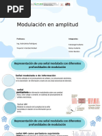)ue en0iar una se/al entre dos antenas, una en el e2tremo )ue en0a o )ue transmite la otra en el receptor. #as frecuencias usadas por los sistemas de radio para transmisiones de $" est.n entre 17789z 1: "9z. Una radiofrecuencia tpica de, ,"9z es muc'o m.s alta )ue las frecuencias presentes en la 0oz 'umana. D. Modulacin Este pro!lema puede ser superado usando un proceso llamado modulacin. El sistema de radio puede en0iar [Link] se/ales de alta frecuencia entre un transmisor un receptor, pero este por s mismo, no transporta informacin. $'ora, si lo encendiramos apa(.ramos para ciertos inter0alos, podramos utilizarlo para en0iar la informacin. &or e*emplo, podramos encenderlo !re0emente en inter0alos de e2actamente un se(undo proporcionar una se/al de tiempo. #a se/al de alta frecuencia )ue se 'a utilizado para en0iar o lle0ar la informacin de un lu(ar a otro se llama onda portadora. #a onda portadora se de!e modificar de cierta forma para transportar la 0oz al receptor. #a se/al de 0oz representa la informacin )ue seseamos en0iar por lo tanto esta se/al es llamada se/al de informacin. +i(.;. E. Profundidad de modulacin #a cantidad en la cual la amplitud de la onda portadora aumenta disminu e depende de la amplitud de la se/al de informacin se llama profundidad de modulacin. #a profundidad de modulacin se puede representar como fraccin o porcenta*e. En la +i(.<. -e puede apreciar )ue la onda portadora modulada 0ara de un 0alor de pico a pico m.2imo de ,75, a un 0alor mnimo de ;5. F. El espectro de frecuencia $suma una frecuencia portadora de ,"9z una amplitud de pico a pico de, :5. #a portadora se podra mostrar como la +i(.=. -i tam!in tenemos una se/al de informacin de ,89z, o frecuencia de modulacin, con una amplitud de pico a pico de 15 tendremos lo si(uiente, 0er +i(.>. Cuando am!as se/ales 'an pasado atre0es del modulador de amplitud, esta se com!inan para producir una onda de amplitud modulada. #a se/al resultante $" tiene un nue0o espectro de frecuencia, mostrado en la +i(.,7.
