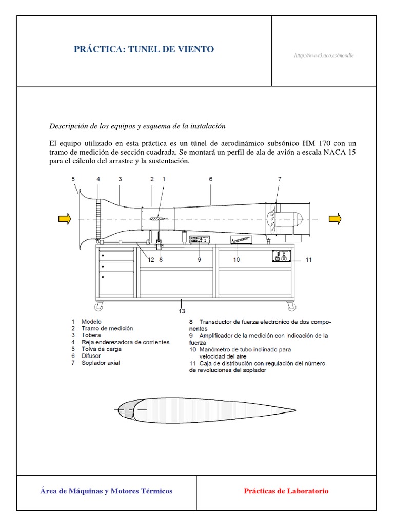 Descripcin de los equipos y esquema de la instalacin El equipo utilizado en esta prctica es un tnel de aerodinmico subsnico HM 170 con un tramo de medicin de seccin cuadrada. Se montar un perfil de ala de avin a escala NACA 15 para el clculo del arrastre y la sustentacin.