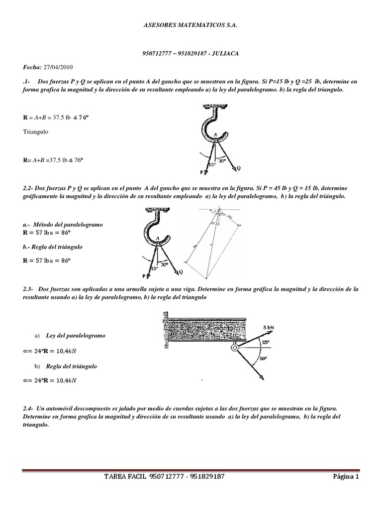 950712777 951829187 - JULIACA Fecha: 27/04/2010 .1- Dos fuerzas P y Q se aplican en el punto A del gancho que se muestran en la figura. Si P=15 lb y Q =25 lb, determine en forma grafica la magnitud y la direccin de su resultante empleando a) la ley del paralelogramo. b) la regla del triangulo.