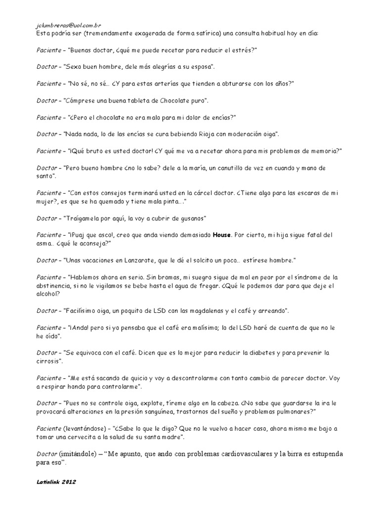 Paciente !uenas doctor" #$u% me puede recetar para reducir el estr%s&' (octor )exo buen hombre" dele m*s alegras a su esposa'. Paciente +o s%" no s%, #- para estas arteras $ue tienden a obturarse con los a.os&' (octor /0mprese una buena tableta de /hocolate puro'. Paciente #Pero el chocolate no era malo para mi dolor de encas&' (octor +ada nada" lo de las encas se cura bebiendo 1ioja con moderaci0n oiga'. Paciente 23u% bruto es usted doctor4 #- $u% me 5a a recetar ahora para mis problemas de memoria&' (octor Pero bueno hombre #no lo sabe& dele a la mara" un canutillo de 5e6 en cuando y mano de santo'. Paciente /on estos consejos terminar* usted en la c*rcel doctor. #7iene algo para las escaras de mi mujer&" es $ue se ha $uemado y tiene mala pinta,.' (octor 7ragamela por a$u" la 5oy a cubrir de gusanos' Paciente 2Puaj $ue asco4" creo $ue anda 5iendo demasiado House. Por cierto" mi hija sigue fatal del asma, #$u% le aconseja&' (octor 8nas 5acaciones en 9an6arote" $ue le d% el solcito un poco, estrese hombre.' Paciente :ablemos ahora en serio. )in bromas" mi suegro sigue de mal en peor por el sndrome de la abstinencia" si no le 5igilamos se bebe hasta el agua de fregar. #3u% le podemos dar para $ue deje el alcohol& (octor ;acilsimo oiga" un po$uito de 9)( con las magdalenas y el caf% y arreando'. Paciente 2<nda4 pero si yo pensaba $ue el caf% era malsimo= lo del 9)( har% de cuenta de $ue no le he odo'. (octor )e e$ui5oca con el caf%. (icen $ue es lo mejor para reducir la diabetes y para pre5enir la cirrosis'. Paciente >e est* sacando de $uicio y 5oy a descontrolarme con tanto cambio de parecer doctor. ?oy a respirar hondo para controlarme'. (octor Pues no se controle oiga" explote" treme algo en la cabe6a. #+o sabe $ue guardarse la ira le pro5ocar* alteraciones en la presi0n sangunea" trastornos del sue.o y problemas pulmonares&' Paciente (le5ant*ndose) #)abe lo $ue le digo& 3ue no le 5uel5o a hacer caso" ahora mismo me bajo a tomar una cer5ecita a la salud de su santa madre'. (octor (imitndole) Me apunto, que ando con problemas cardiovasculares y la birra es estupenda