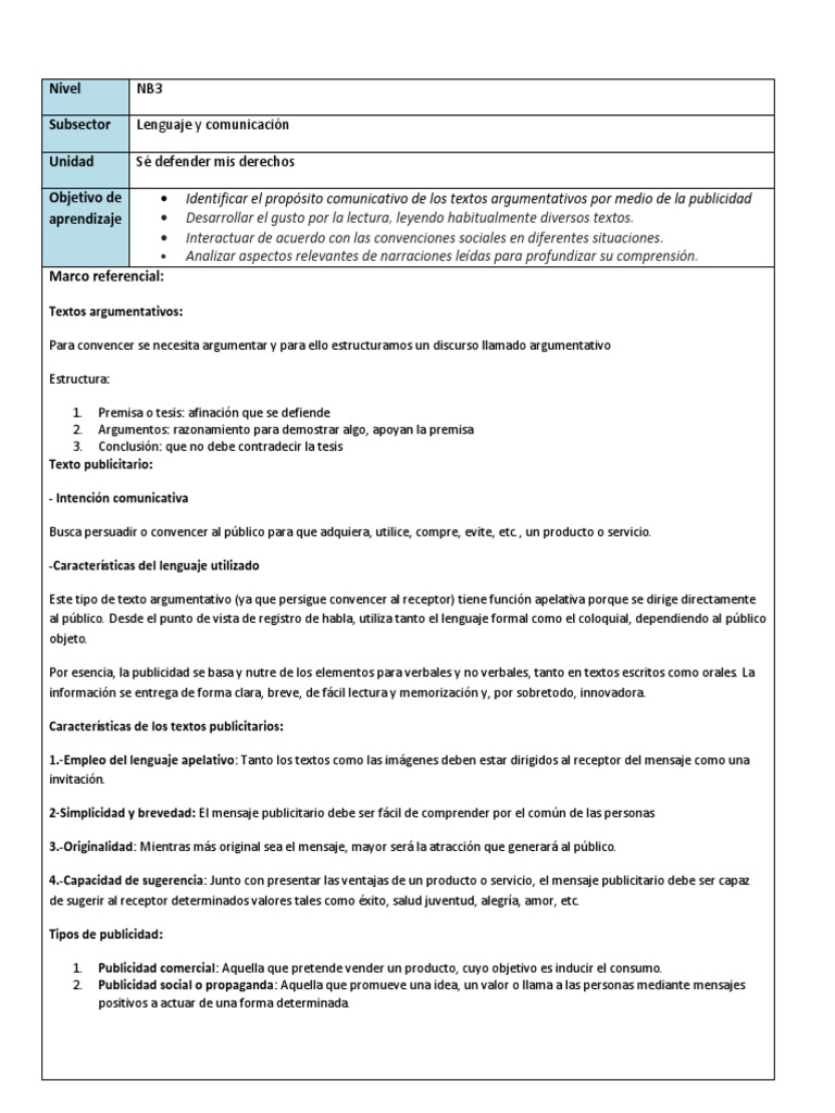 Textos argumentativos: Para convencer se necesita argumentar y para ello estructuramos un discurso llamado argumentativo Estructura: 1. Premisa o tesis: afinacin que se defiende 2. Argumentos: razonamiento para demostrar algo, apoyan la premisa 3. Conclusin: que no debe contradecir la tesis Texto publicitario: - Intencin comunicativa Busca persuadir o convencer al pblico para que adquiera, utilice, compre, evite, etc., un producto o servicio. -Caractersticas del lenguaje utilizado Este tipo de texto argumentativo (ya que persigue convencer al receptor) tiene funcin apelativa porque se dirige directamente al pblico. Desde el punto de vista de registro de habla, utiliza tanto el lenguaje formal como el coloquial, dependiendo al pblico objeto. Por esencia, la publicidad se basa y nutre de los elementos para verbales y no verbales, tanto en textos escritos como orales. La informacin se entrega de forma clara, breve, de fcil lectura y memorizacin y, por sobretodo, innovadora. Caractersticas de los textos publicitarios: 1.-Empleo del lenguaje apelativo: Tanto los textos como las imgenes deben estar dirigidos al receptor del mensaje como una invitacin. 2-Simplicidad y brevedad: El mensaje publicitario debe ser fcil de comprender por el comn de las personas 3.-Originalidad: Mientras ms original sea el mensaje, mayor ser la atraccin que generar al pblico. 4.-Capacidad de sugerencia: Junto con presentar las ventajas de un producto o servicio, el mensaje publicitario debe ser capaz de sugerir al receptor determinados valores tales como xito, salud juventud, alegra, amor, etc. Tipos de publicidad: 1. 2. Publicidad comercial: Aquella que pretende vender un producto, cuyo objetivo es inducir el consumo. Publicidad social o propaganda: Aquella que promueve una idea, un valor o llama a las personas mediante mensajes positivos a actuar de una forma determinada.