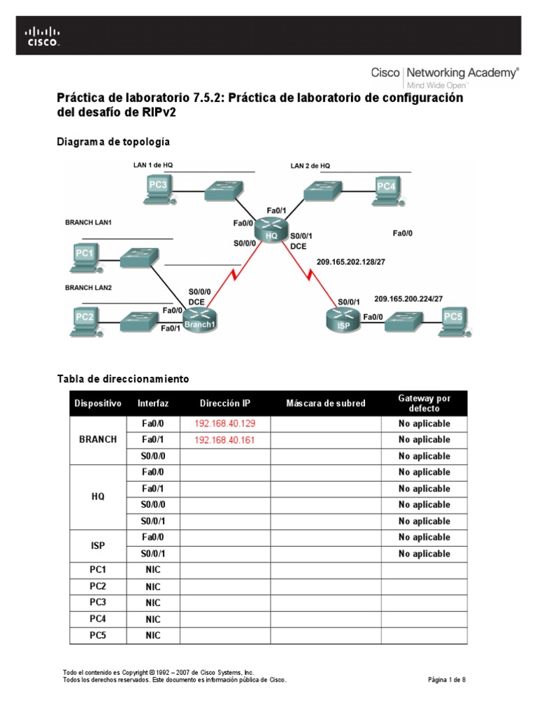 Prctica de laboratorio de configuracin del desafo de RIPv2