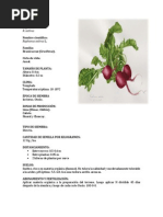 2. TAXONOMA Y MORFOLOGA -Familia: Cruciferae. -Nombre cientfico: Raphanus sativus L. -Planta: anual o bienal. -Sistema radicular: raz gruesa, carnosa, muy variable en cuanto a la forma y al tamao, de piel roja, rosada, blanca, pardo-oscura o manchada de diversos colores. -Tallo: breve antes de la floracin, con una roseta de hojas. Posteriormente, cuando florece la planta, se alarga alcanzando una altura de 0,50 a 1 m, de color glauco y algo pubescente. -Hojas: basales, pecioladas, glabras o con unos pocos pelos hirsutos, de lmina lobulada o pinnatipartida, con 1-3 pares de segmentos laterales de borde irregularmente dentado; el segmento terminal es orbicular y ms grande que los laterales; hojas caulinas escasas, pequeas, oblongas, glaucas, algo pubescentes, menos lobuladas y dentadas que las basales. -Flores: dispuestas sobre pedicelos delgados, ascendentes, en racimos grandes y abiertos; spalos erguidos; ptalos casi siempre blancos, a veces rosados o amarillentos, con nervios violceos o prpura; 6 estambres libres; estilo delgado con un estigma ligeramente lobulado. -Fruto: silcula de 3-10 cm de longitud, esponjoso, indehiscente, con un pico largo. Semillas globosas o casi globosas, rosadas o castao-claras, con un tinte amarillento; cada fruto contiene de 1 a 10 semillas incluidas en un tejido esponjoso.