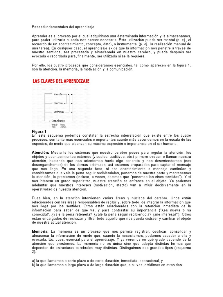 Figura 1 En este esquema podemos constatar la estrec$a interrelacin que existe entre los cuatro procesos% son tanto m&s esenciales e importantes cuanto m&s ascendemos en la escala de las especies, de modo que alcanzan su m&xima expresin e importancia en el ser $umano. Atencin: 'ediante los sistemas que nuestro cere!ro posee para regular la atencin, los o!jetos y acontecimientos externos (visuales, auditivos, etc.) primero evocan o llaman nuestra atencin, $aciendo que nos orientamos $acia algo concreto y nos desentendamos (nos desenganc$emos) de los dem&s est(mulos) as( estamos preparados para captar el mensaje que nos llega. En una segunda fase, si ese acontecimiento o mensaje contin*an y consideramos que vale la pena seguir reci!i ndolos, ponemos de nuestra parte y mantenemos la atencin, la prestamos (incluso, a veces, decimos que +ponemos los cinco sentidos+). , si nos interesa en grado superlativo, nuestra atencin se enfrasca en el o!jeto. ,a podemos adelantar que nuestros intereses (motivacin, afecto) van a influir decisivamente en la operatividad de nuestra atencin. "ues !ien, en la atencin intervienen varias &reas y n*cleos del cere!ro. -nos est&n relacionados con las &reas responsa!les de reci!ir y, so!re todo, de integrar la informacin que nos llega por los sentidos. .tros est&n relacionados con la retencin inmediata de la informacin para sa!er de qu va, y para contrastar su importancia (+/es nueva o ya conocida0, /vale la pena retenerla0 /vale la pena seguir reci!i ndola0 /me interesa0+). .tros est&n encargados de rec$azar y filtrar todo aquello que nos pueda distraer y cam!iar el o!jeto de nuestra actual atencin. Memoria: 1a memoria es un proceso que nos permite registrar, codificar, consolidar y almacenar la informacin de modo que, cuando la necesitemos, podamos acceder a ella y evocarla. Es, pues, esencial para el aprendizaje. , ya veremos en qu grado depende de la atencin que prestemos. 1a memoria no es *nica sino que adopta distintas formas que dependen de estructuras cere!rales muy distintas. 2istinguimos dos grandes tipos (esquema 3)% a) la que llamamos a corto plazo o de corta duracin, inmediata, operacional, y !) la que llamamos a largo plazo o de larga duracin que, a su vez, dividimos en otras dos%
