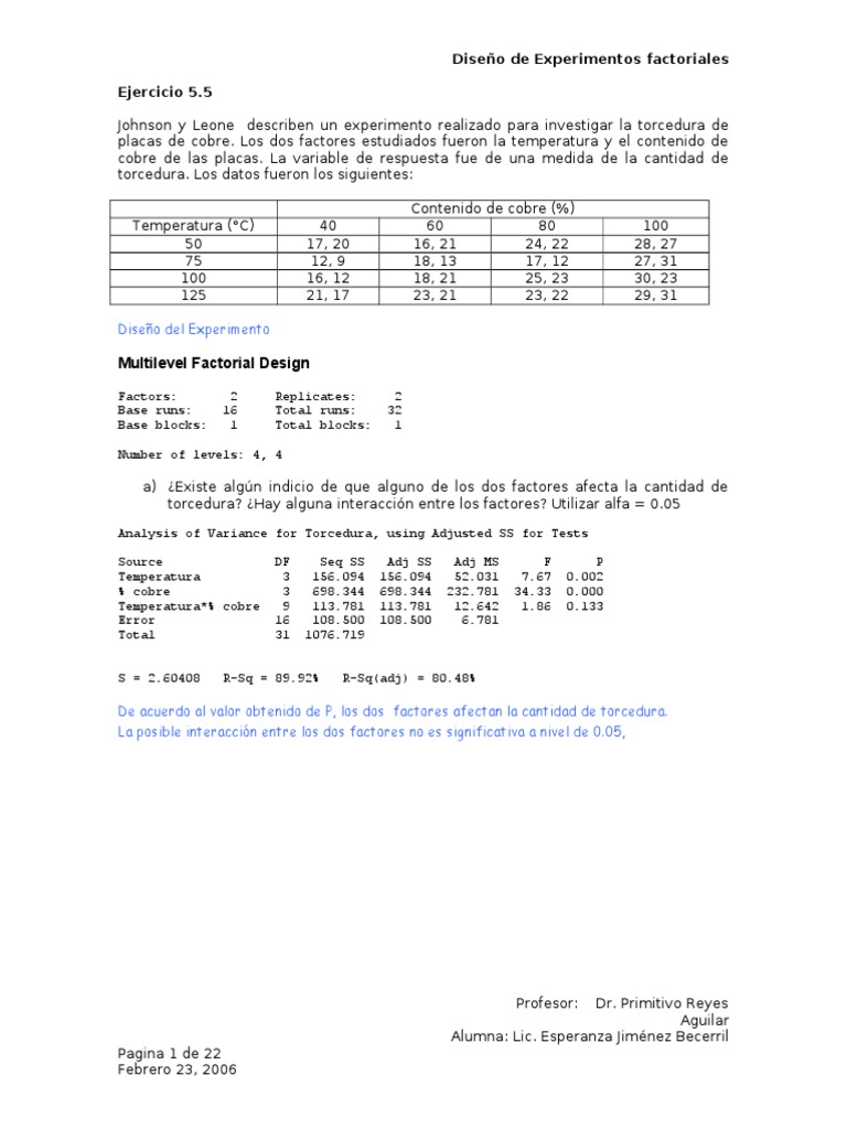 Los dos factores estudiados fueron la temperatura y el contenido de cobre de las placas. La variable de respuesta fue de una medida de la cantidad de torcedura. Los datos fueron los siguientes: emperatura (!C) '# (' &## &*' Diseo del Experimento "# &() *# &*) + &$) &* *&) &( Contenido de cobre (%) $# %# &$) *& *") ** &%) &, &() &* &%) *& *') *, *,) *& *,) ** &## *%) *( *() ,& ,#) *, *+) ,&
