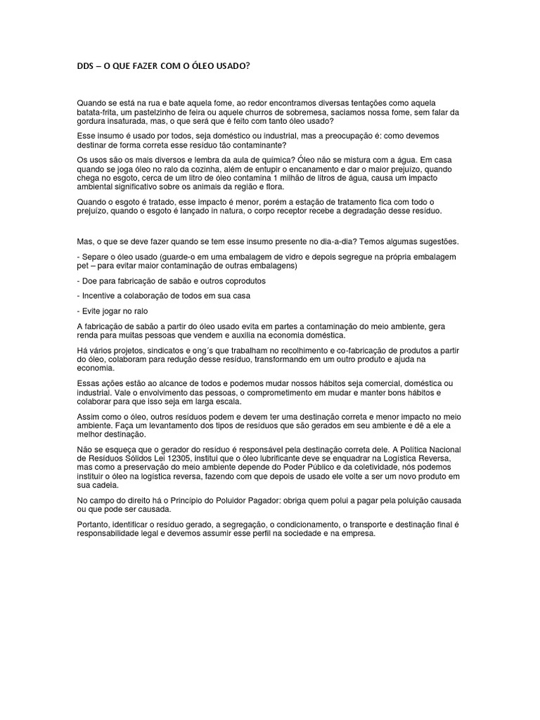 Mas, o que se deve fazer quando se tem esse insumo presente no dia-a-dia? Temos algumas sugestões. - Separe o óleo usado (guarde-o em uma embalagem de vidro e depois segregue na própria embalagem pet – para evitar maior contaminação de outras embalagens) - Doe para fabricação de sabão e outros coprodutos - Incentive a colaboração de todos em sua casa - Evite jogar no ralo A fabricação de sabão a partir do óleo usado evita em partes a contaminação do meio ambiente, gera renda para muitas pessoas que vendem e auxilia na economia doméstica. Há vários projetos, sindicatos e ong´s que trabalham no recolhimento e co-fabricação de produtos a partir do óleo, colaboram para redução desse resíduo, transformando em um outro produto e ajuda na economia. Essas ações estão ao alcance de todos e podemos mudar nossos hábitos seja comercial, doméstica ou industrial. Vale o envolvimento das pessoas, o comprometimento em mudar e manter bons hábitos e colaborar para que isso seja em larga escala. Assim como o óleo, outros resíduos podem e devem ter uma destinação correta e menor impacto no meio ambiente. Faça um levantamento dos tipos de resíduos que são gerados em seu ambiente e dê a ele a melhor destinação. Não se esqueça que o gerador do resíduo é responsável pela destinação correta dele. A Política Nacional de Resíduos Sólidos Lei 12305, institui que o óleo lubrificante deve se enquadrar na Logística Reversa, mas como a preservação do meio ambiente depende do Poder Público e da coletividade, nós podemos instituir o óleo na logística reversa, fazendo com que depois de usado ele volte a ser um novo produto em sua cadeia. No campo do direito há o Princípio do Poluidor Pagador: obriga quem polui a pagar pela poluição causada ou que pode ser causada. Portanto, identificar o resíduo gerado, a segregação, o condicionamento, o transporte e destinação final é responsabilidade legal e devemos assumir esse perfil na sociedade e na empresa.