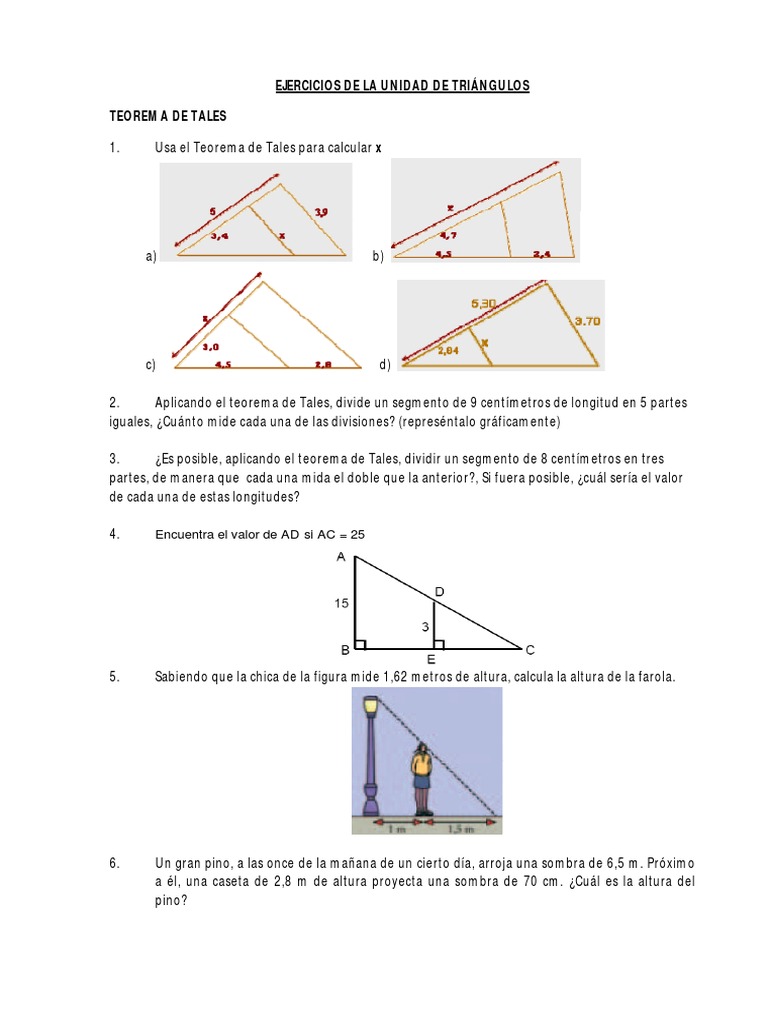 2. Aplicando el teorema de Tales, divide un segmento de 9 centmetros de longitud en 5 partes iguales, Cunto mide cada una de las divisiones? (represntalo grficamente) 3. Es posible, aplicando el teorema de Tales, dividir un segmento de 8 centmetros en tres partes, de manera que cada una mida el doble que la anterior?, Si fuera posible, cul sera el valor de cada una de estas longitudes? 4.