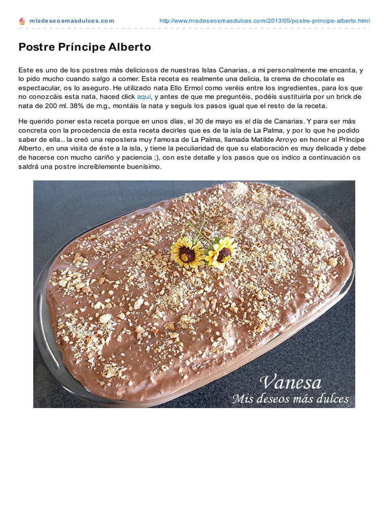 Este es uno de los postres ms deliciosos de nuestras Islas Canarias, a mi personalmente me encanta, y lo pido mucho cuando salgo a comer. Esta receta es realmente una delicia, la crema de chocolate es espectacular, os lo aseguro. He utilizado nata Ello Ermol como veris entre los ingredientes, para los que no conozcis esta nata, haced click aqu, y antes de que me preguntis, podis sustituirla por un brick de nata de 200 ml. 38% de m.g., montis la nata y segus los pasos igual que el resto de la receta. He querido poner esta receta porque en unos das, el 30 de mayo es el da de Canarias. Y para ser ms concreta con la procedencia de esta receta decirles que es de la isla de La Palma, y por lo que he podido saber de ella... la cre una repostera muy f amosa de La Palma, llamada Matilde Arroyo en honor al Prncipe Alberto, en una visita de ste a la isla, y tiene la peculiaridad de que su elaboracin es muy delicada y debe de hacerse con mucho cario y paciencia ;), con este detalle y los pasos que os indico a continuacin os saldr una postre increblemente buensimo.