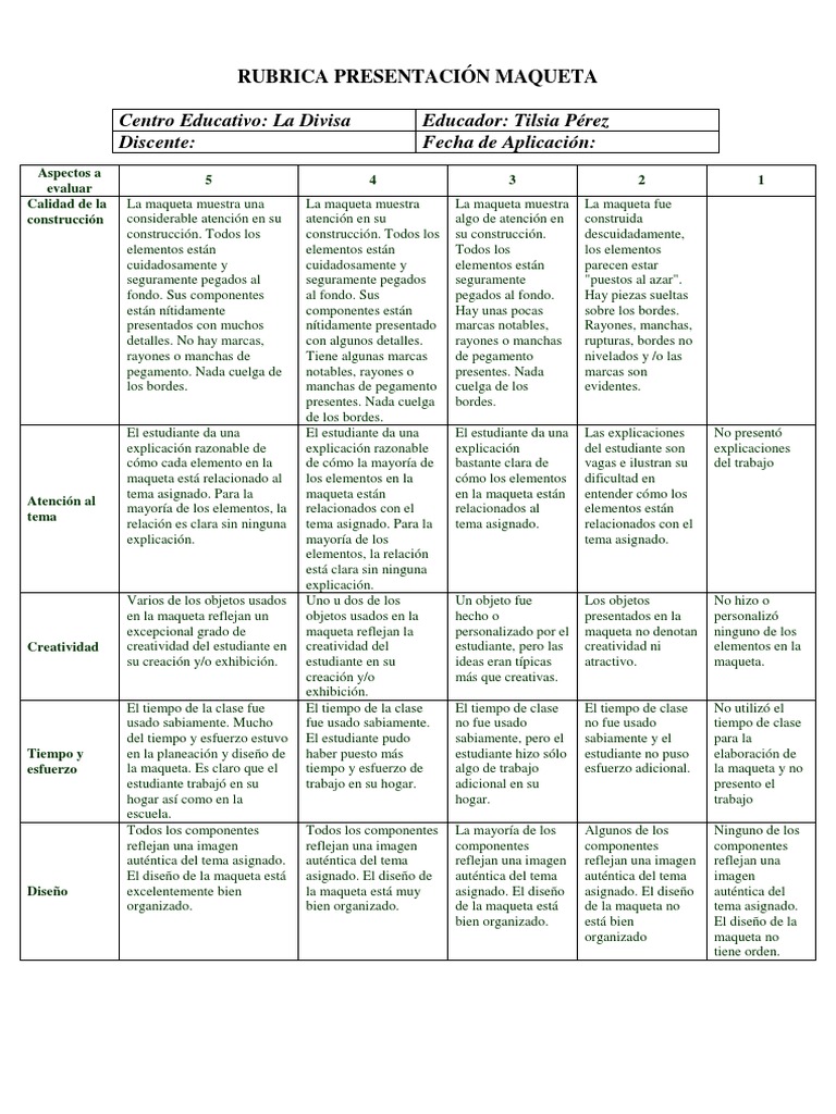 RUBRICA PRESENTACIN MAQUETA Centro Educativo: La Divisa Discente: