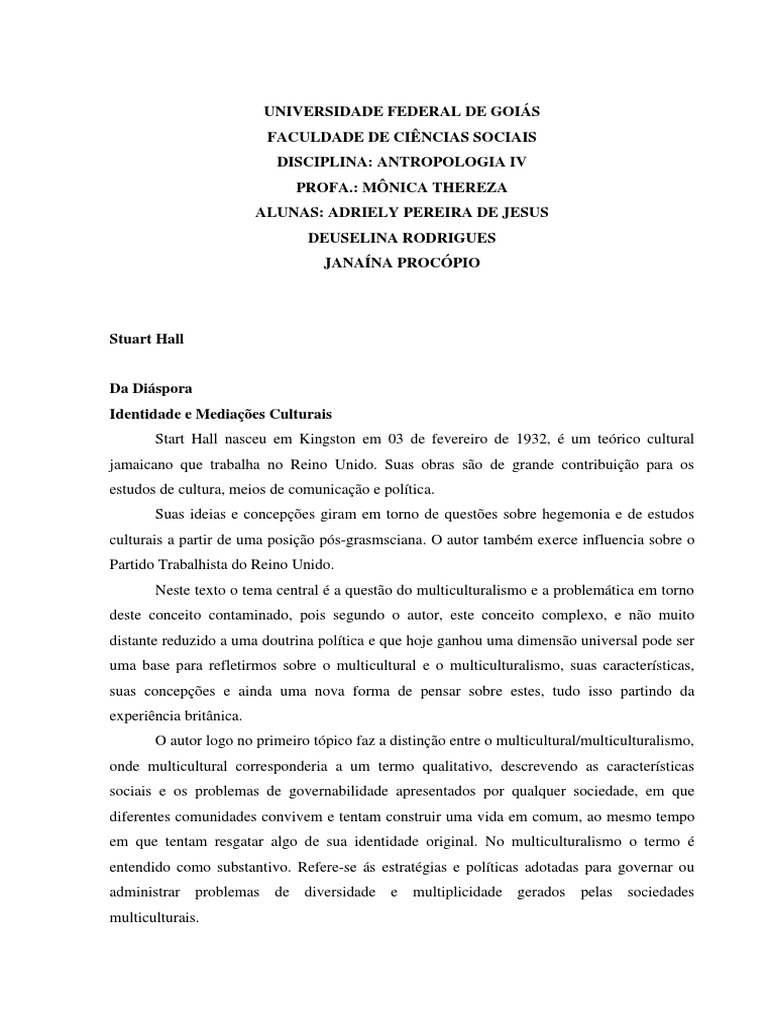 Da Dispora Identidade e Mediaes Culturais Start Hall nasceu em Kingston em 03 de fevereiro de 1932, um terico cultural jamaicano que trabalha no Reino Unido. Suas obras so de grande contribuio para os estudos de cultura, meios de comunicao e poltica. Suas ideias e concepes giram em torno de questes sobre hegemonia e de estudos culturais a partir de uma posio ps-grasmsciana. O autor tambm exerce influencia sobre o Partido Trabalhista do Reino Unido. Neste texto o tema central a questo do multiculturalismo e a problemtica em torno deste conceito contaminado, pois segundo o autor, este conceito complexo, e no muito distante reduzido a uma doutrina poltica e que hoje ganhou uma dimenso universal pode ser uma base para refletirmos sobre o multicultural e o multiculturalismo, suas caractersticas, suas concepes e ainda uma nova forma de pensar sobre estes, tudo isso partindo da experincia britnica. O autor logo no primeiro tpico faz a distino entre o multicultural/multiculturalismo, onde multicultural corresponderia a um termo qualitativo, descrevendo as caractersticas sociais e os problemas de governabilidade apresentados por qualquer sociedade, em que diferentes comunidades convivem e tentam construir uma vida em comum, ao mesmo tempo em que tentam resgatar algo de sua identidade original. No multiculturalismo o termo entendido como substantivo. Refere-se s estratgias e polticas adotadas para governar ou administrar problemas de diversidade e multiplicidade gerados pelas sociedades multiculturais.