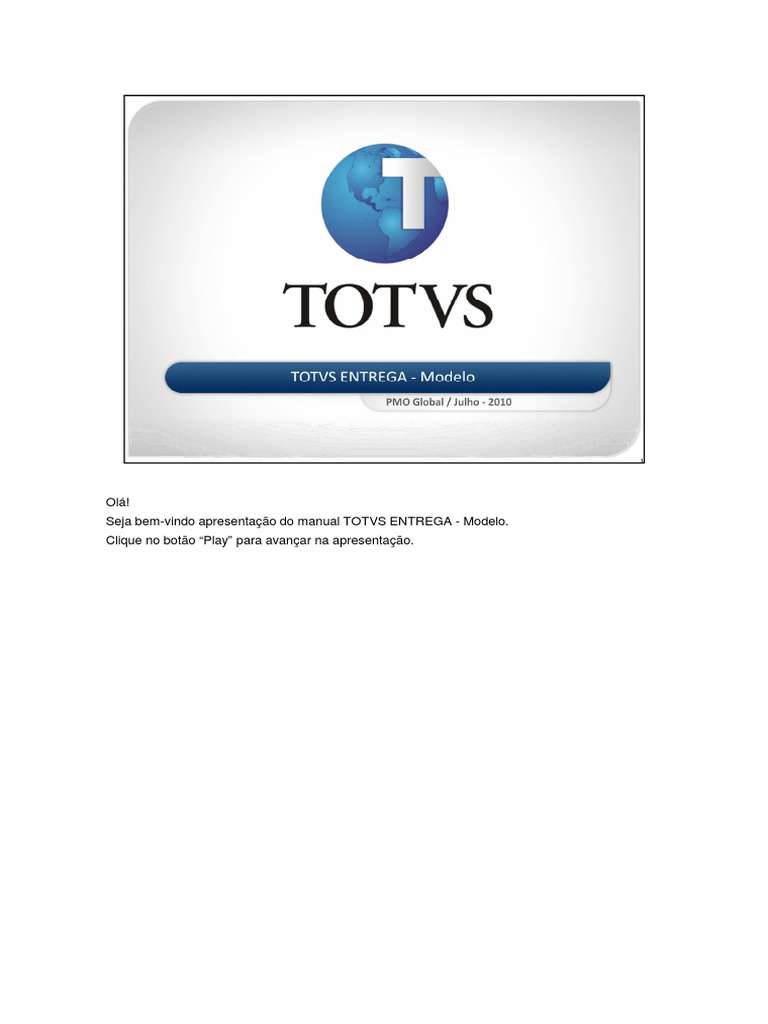 Objetivo do TOTVS Entrega O TOTVS ENTREGA - MODELO um importante Guia de Referncia para a formao e capacitao de todos os participantes TOTVS. Por meio de uma linguagem simples e acessvel, ele define, exemplifica, padroniza e dissemina a mensagem, os discursos, as melhores prticas, as posturas desejadas e as melhores formas de atendimento a prospects e clientes TOTVS.