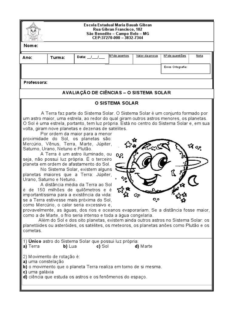 AVALIA67O 3E *I8N*IAS ) O SISTEMA SOLAR O SISTEMA SOLAR A Terra faz parte do Sistema Solar. O Sistema Solar um conjunto formado por um astro maior, uma estrela, ao redor do qual giram outros astros menores, os planetas. O Sol uma estrela, portanto, tem luz prpria. Est no centro do Sistema Solar e, em sua volta, giram nove planetas e dezenas de satlites. or ordem da maior para a menor pro!imidade do Sol, os planetas s"o# $erc%rio, &'nus, Terra, $arte, (%piter, Saturno, )rano, *etuno e lut"o. A Terra um astro iluminado, ou seja, n"o possui luz prpria. + o terceiro planeta em ordem de afastamento do Sol. *o Sistema Solar, e!istem alguns planetas maiores que a Terra# (%piter, )rano, Saturno e *etuno. A dist,ncia mdia da Terra ao Sol de -./ mil01es de quil2metros e important3ssima para a e!ist'ncia da vida# se a Terra estivesse mais pr!ima do Sol, como $erc%rio, o calor seria e!cessivo e, provavelmente, as guas, dos rios e oceanos evaporariam. Se a dist,ncia fosse maior, como a de $arte, o frio seria intenso e toda a gua congelaria. Alm do Sol e dos oito planetas, e!istem ainda outros astros no Sistema Solar# os planetides ou asterides, os satlites, os meteoros, os planetas an1es como lut"o e os cometas. -4 nico astro do Sistema Solar que possui luz prpria# a) Terra b) 5ua c) Sol d) $arte 64 $ovimento de rota7"o # a) uma constela7"o b) o movimento que o planeta Terra realiza em torno de si mesma. c) uma gal!ia d) ci'ncia que estuda os astros e os fen2menos do espa7o.
