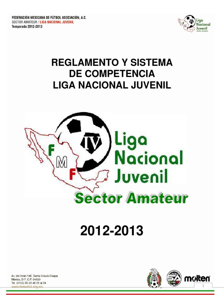 ARTCULO 1.- El presente Reglamento de Competencia es aplicable para el Torneo en la Fase de Zonas, as como, para la Fase Nacional, los cuales componen la Temporada de la Liga Nacional Juvenil del Sector Amateur de la Federacin Mexicana de Ftbol Asociacin, A.C. La Temporada tendr dos fases: la Fase de Zonas y la Fase Nacional. En la Fase de Zonas participan todos los equipos inscritos al Torneo (excepto aquellos que estn sancionados con la descalificacin del torneo o temporada; en tanto que en la Fase Nacional participarn los equipos campeones de cada zona.