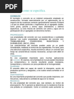 Aditivos Son compuestos qumicos que, aadidos en pequeas cantidades, modifican las propiedades del hormign. Entre los de usos ms frecuentes estn los acelerantes, retardantes y plastificantes. Los aditivos siempre deben ser probados previamente a su utilizacin en obra, por la gran variabilidad cuando se combinan aditivos. ESPECIFICACIONES TCNICAS DEL HORMIGN EN OBRA Las especificaciones tcnicas son el punto de partida para el diseo de los hormigones. Entre las propiedades ms importantes que deben considerarse se tiene: Resistencia a la compresin Trabajabilidad del hormign fresco Velocidad de fraguado Peso especifico RESISTENCIA DEL HORMIGON Esta se la cuantifica a los 28 das de fundido el concreto, aunque en estructuras especiales como tneles y presas, o cuando se emplean cementos especiales, pueden definirse tiempos menores o mayores a esos 28 das.