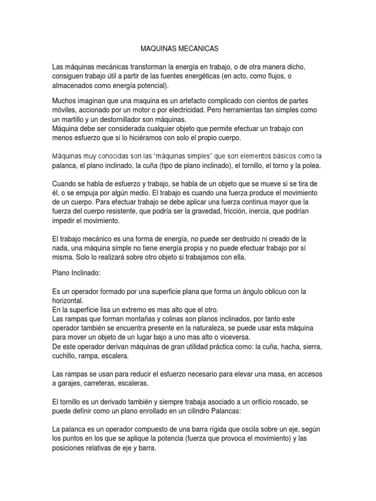 de las fuentes energticas (en acto, como flujos, o almacenados como energa potencial). Muchos imaginan que una maquina es un artefacto complicado con cientos de partes mviles, accionado por un motor o por electricidad. Pero herramientas tan simples como un martillo y un destornillador son mquinas. Mquina debe ser considerada cualquier objeto que permite efectuar un trabajo con menos esfuerzo que si lo hiciramos con solo el propio cuerpo. Mquinas muy conocidas son las mquinas simples que son elementos bsicos como la palanca, el plano inclinado, la cua (tipo de plano inclinado), el tornillo, el torno y la polea. Cuando se habla de esfuerzo y trabajo, se habla de un objeto que se mueve si se tira de l, o se empuja por algn medio. El trabajo es cuando una fuerza produce el movimiento de un cuerpo. Para efectuar trabajo se debe aplicar una fuerza continua mayor que la fuerza del cuerpo resistente, que podra ser la gravedad, friccin, inercia, que podran impedir el movimiento. El trabajo mecnico es una forma de energa, no puede ser destruido ni creado de la nada, una mquina simple no tiene energa propia y no puede efectuar trabajo por s misma. Solo lo realizar sobre otro objeto si trabajamos con ella. Plano Inclinado: Es un operador formado por una superficie plana que forma un ngulo oblicuo con la horizontal. En la superficie lisa un extremo es mas alto que el otro. Las rampas que forman montaas y colinas son planos inclinados, por tanto este operador tambin se encuentra presente en la naturaleza, se puede usar esta mquina para mover un objeto de un lugar bajo a uno mas alto o viceversa. De este operador derivan mquinas de gran utilidad prctica como: la cua, hacha, sierra, cuchillo, rampa, escalera. Las rampas se usan para reducir el esfuerzo necesario para elevar una masa, en accesos a garajes, carreteras, escaleras. El tornillo es un derivado tambin y siempre trabaja asociado a un orificio roscado, se puede definir como un plano enrollado en un cilindro Palancas: La palanca es un operador compuesto de una barra rgida que oscila sobre un eje, segn los puntos en los que se aplique la potencia (fuerza que provoca el movimiento) y las posiciones relativas de eje y barra.