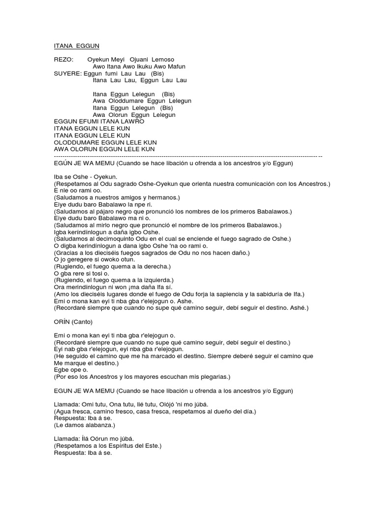 fumi Lau Lau (Bis) Itana Lau Lau, Eggun Lau Lau Itana Eggun Lelegun (Bis) Awa Oloddumare Eggun Lelegun Itana Eggun Lelegun (Bis) Awa Olorun Eggun Lelegun EGGUN EFUMI ITANA LAWRO ITANA EGGUN LELE KUN ITANA EGGUN LELE KUN OLODDUMARE EGGUN LELE KUN AWA OLORUN EGGUN LELE KUN ----------------------------------------------------------------------------------------------------------------------------- -EGN JE WA MEMU (Cuando se hace libacin u ofrenda a los ancestros y/o Eggun) Iba se Oshe - Oyekun. (Respetamos al Odu sagrado Oshe-Oyekun que orienta nuestra comunicacin con los Ancestros.) E nle oo rami oo. (Saludamos a nuestros amigos y hermanos.) Eiye dudu baro Babalawo la npe ri. (Saludamos al pjaro negro que pronunci los nombres de los primeros Babalawos.) Eiye dudu baro Babalawo ma ni o. (Saludamos al mirlo negro que pronunci el nombre de los primeros Babalawos.) Igba kerndnlogun a daa igbo Oshe. (Saludamos al decimoquinto Odu en el cual se enciende el fuego sagrado de Oshe.) O digba kerindnlogun a dana igbo Oshe 'na oo rami o. (Gracias a los diecisis fuegos sagrados de Odu no nos hacen dao.) O jo geregere si owoko otun. (Rugiendo, el fuego quema a la derecha.) O gba rere si tosi o. (Rugiendo, el fuego quema a la izquierda.) Ora merindnlogun ni won ma daa Ifa s. (Amo los diecisis lugares donde el fuego de Odu forja la sapiencia y la sabidura de Ifa.) Emi o mona kan eyi ti nba gba r'elejogun o. Ashe. (Recordar siempre que cuando no supe qu camino seguir, deb seguir el destino. Ash.) ORN (Canto) Emi o mona kan eyi ti nba gba r'elejogun o. (Recordar siempre que cuando no supe qu camino seguir, deb seguir el destino.) Eyi nab gba r'elejogun, eyi nba gba r'elejogun. (He seguido el camino que me ha marcado el destino. Siempre deber seguir el camino que Me marque el destino.) Egbe ope o. (Por eso los Ancestros y los mayores escuchan mis plegarias.) EGUN JE WA MEMU (Cuando se hace libacin u ofrenda a los ancestros y/o Eggun) Llamada: Omi tutu, Ona tutu, li tutu, Olj 'ni mo jb. (Agua fresca, camino fresco, casa fresca, respetamos al dueo del da.) Respuesta: Iba se. (Le damos alabanza.) Llamada: l Orun mo jb. (Respetamos a los Espritus del Este.) Respuesta: Iba se.