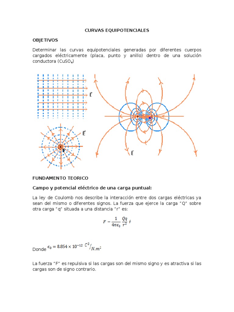 FUNDAMENTO TEORICO Campo y potencial el ct!ico "e #na ca!$a p#nt#al% La ley de Coulom nos descri e la interaccin entre dos cargas elctricas ya sean del mismo o diferentes signos! La fuer"a que e#erce la carga $%& so re otra carga $q& situada a una distancia $r& es'