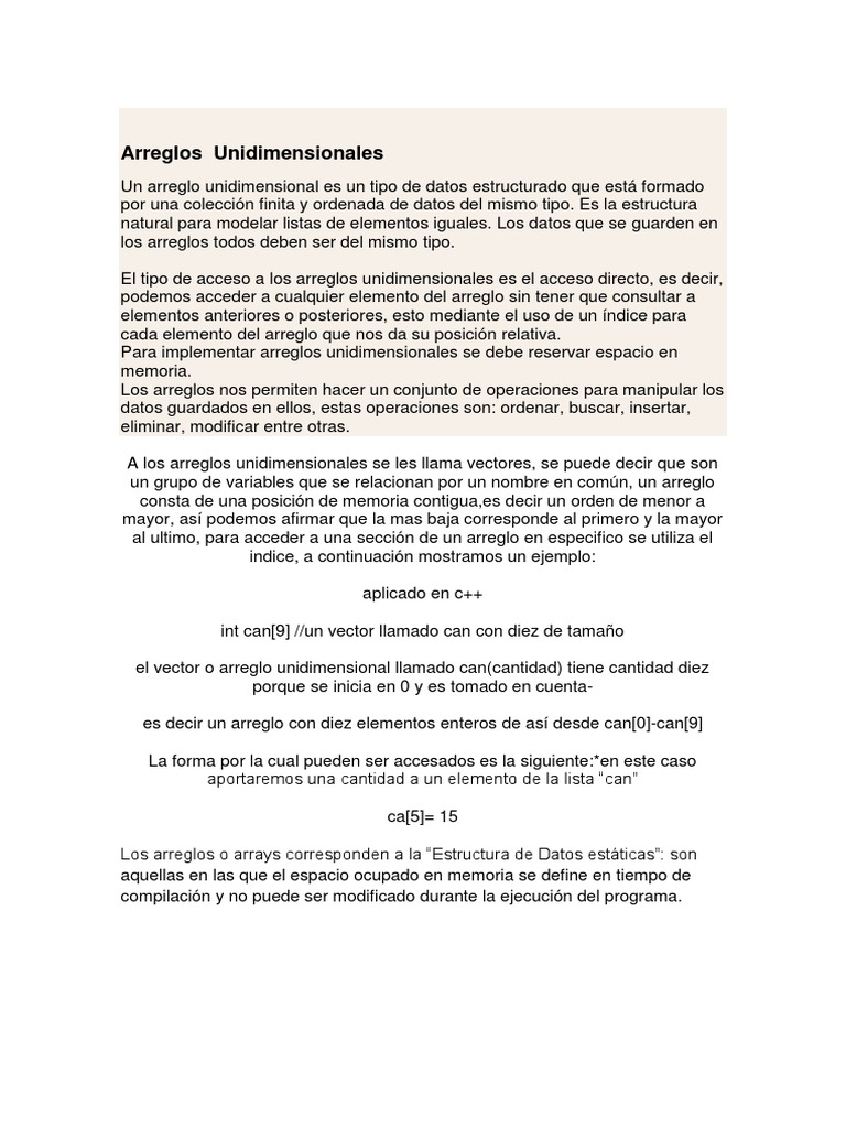 Un arreglo unidimensional es un tipo de datos estructurado que est formado por una coleccin finita y ordenada de datos del mismo tipo. Es la estructura natural para modelar listas de elementos iguales. Los datos que se guarden en los arreglos todos deben ser del mismo tipo. El tipo de acceso a los arreglos unidimensionales es el acceso directo, es decir, podemos acceder a cualquier elemento del arreglo sin tener que consultar a elementos anteriores o posteriores, esto mediante el uso de un ndice para cada elemento del arreglo que nos da su posicin relativa. Para implementar arreglos unidimensionales se debe reservar espacio en memoria. Los arreglos nos permiten hacer un conjunto de operaciones para manipular los datos guardados en ellos, estas operaciones son: ordenar, buscar, insertar, eliminar, modificar entre otras. A los arreglos unidimensionales se les llama vectores, se puede decir que son un grupo de variables que se relacionan por un nombre en comn, un arreglo consta de una posicin de memoria contigua,es decir un orden de menor a mayor, as podemos afirmar que la mas baja corresponde al primero y la mayor al ultimo, para acceder a una seccin de un arreglo en especifico se utiliza el indice, a continuacin mostramos un ejemplo: aplicado en c++ int can[9] //un vector llamado can con diez de tamao el vector o arreglo unidimensional llamado can(cantidad) tiene cantidad diez porque se inicia en 0 y es tomado en cuentaes decir un arreglo con diez elementos enteros de as desde can[0]-can[9] La forma por la cual pueden ser accesados es la siguiente:*en este caso aportaremos una cantidad a un elemento de la lista can ca[5]= 15 Los arreglos o arrays corresponden a la Estructura de Datos estticas: son aquellas en las que el espacio ocupado en memoria se define en tiempo de compilacin y no puede ser modificado durante la ejecucin del programa.