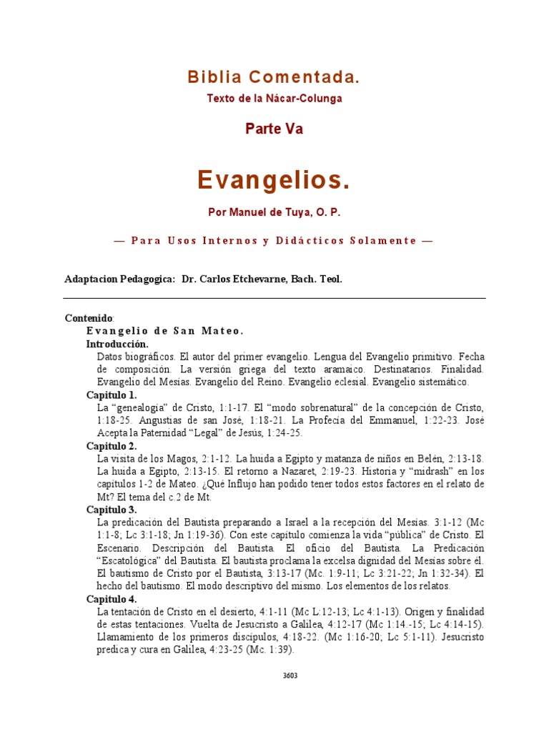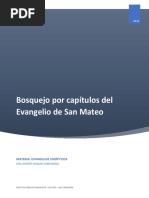 Por Manuel de Tuya, O. P. Para Usos Internos y Didcticos Solamente Adaptacion Pedagogica: Dr. Carlos Etchevarne, Bach. Teol. Contenido: Evangelio de San ate. Introduccin. Datos biogrficos. El autor del primer evangelio. Lengua del Evangelio primitivo. Fecha de composicin. La versin griega del texto aramaico. Destinatarios. Finalidad. Evangelio del Mesas. Evangelio del Reino. Evangelio eclesial. Evangelio sistemtico. Capitulo 1. La genealoga de Cristo, 1:1-17. El modo sobrenatural de la concepcin de Cristo, 1:18-25. Angustias de san Jos, 1:18-21. La Profeca del Emmanuel, 1:22-23. Jos Acepta la Paternidad Legal de Jess, 1:24-25. Capitulo 2. La visita de los Magos, 2:1-12. La huida a Egipto y matanza de nios en Beln, 2:13-18. La huida a Egipto, 2:13-15. El retorno a Nazaret, 2:19-23. Historia y midrash en los captulos 1-2 de Mateo. Qu Influjo han podido tener todos estos factores en el relato de Mt? El tema del c.2 de Mt. Capitulo 3. La predicacin del Bautista preparando a Israel a la recepcin del Mesas. 3:1-12 (Mc 1:1-8; Lc 3:1-18; Jn 1:19-36). Con este captulo comienza la vida pblica de Cristo. El Escenario. Descripcin del Bautista. El oficio del Bautista. La Predicacin Escatolgica del Bautista. El bautista proclama la excelsa dignidad del Mesas sobre l. El bautismo de Cristo por el Bautista, 3:13-17 (Mc. 1:9-11; Lc 3:21-22; Jn 1:32-34). El hecho del bautismo. El modo descriptivo del mismo. Los elementos de los relatos. Capitulo 4. La tentacin de Cristo en el desierto, 4:1-11 (Mc L:12-13; Lc 4:1-13). Origen y finalidad de estas tentaciones. Vuelta de Jesucristo a Galilea, 4:12-17 (Mc 1:14.-15; Lc 4:14-15). Llamamiento de los primeros discpulos, 4:18-22. (Mc 1:16-20; Lc 5:1-11). Jesucristo predica y cura en Galilea, 4:23-25 (Mc. 1:39).
