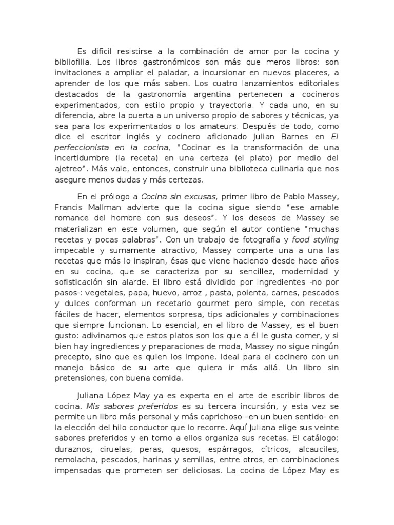 Los libros gastronmicos son ms que meros libros: son invitaciones a ampliar el paladar, a incursionar en nuevos placeres, a aprender de los que ms saben. Los cuatro lanzamientos editoriales destacados de la gastronoma argentina pertenecen a cocineros experimentados, con estilo propio y trayectoria. cada uno, en su diferencia, abre la puerta a un universo propio de sabores y t!cnicas, ya sea para los experimentados o los amateurs. "espu!s de todo, como dice el escritor ingl!s y cocinero aficionado #ulian $arnes en El perfeccionista en la cocina, %&ocinar es la transformacin de una incertidumbre 'la receta( en una certeza 'el plato( por medio del a)etreo*. +s vale, entonces, construir una biblioteca culinaria que nos asegure menos dudas y ms certezas. En el prlogo a Cocina sin excusas, primer libro de ,ablo +assey, -rancis +allman advierte que la cocina sigue siendo %ese amable romance del .ombre con sus deseos*. los deseos de +assey se materializan en este volumen, que seg/n el autor contiene %muc.as recetas y pocas palabras*. &on un traba)o de fotografa y food styling impecable y sumamente atractivo, +assey comparte una a una las recetas que ms lo inspiran, !sas que viene .aciendo desde .ace a0os en su cocina, que se caracteriza por su sencillez, modernidad y sofisticacin sin alarde. El libro est dividido por ingredientes 1no por pasos1: vegetales, papa, .uevo, arroz , pasta, polenta, carnes, pescados y dulces conforman un recetario gourmet pero simple, con recetas fciles de .acer, elementos sorpresa, tips adicionales y combinaciones que siempre funcionan. Lo esencial, en el libro de +assey, es el buen gusto: adivinamos que estos platos son los que a !l le gusta comer, y si bien .ay ingredientes y preparaciones de moda, +assey no sigue ning/n precepto, sino que es quien los impone. 2deal para el cocinero con un mane)o bsico de su arte que quiera ir ms all. 3n libro sin pretensiones, con buena comida. #uliana Lpez +ay ya es experta en el arte de escribir libros de cocina. Mis sabores preferidos es su tercera incursin, y esta vez se permite un libro ms personal y ms capric.oso 4en un buen sentido1 en la eleccin del .ilo conductor que lo recorre. 5qu #uliana elige sus veinte sabores preferidos y en torno a ellos organiza sus recetas. El catlogo: duraznos, ciruelas, peras, quesos, esprragos, ctricos, alcauciles, remolac.a, pescados, .arinas y semillas, entre otros, en combinaciones impensadas que prometen ser deliciosas. La cocina de Lpez +ay es
