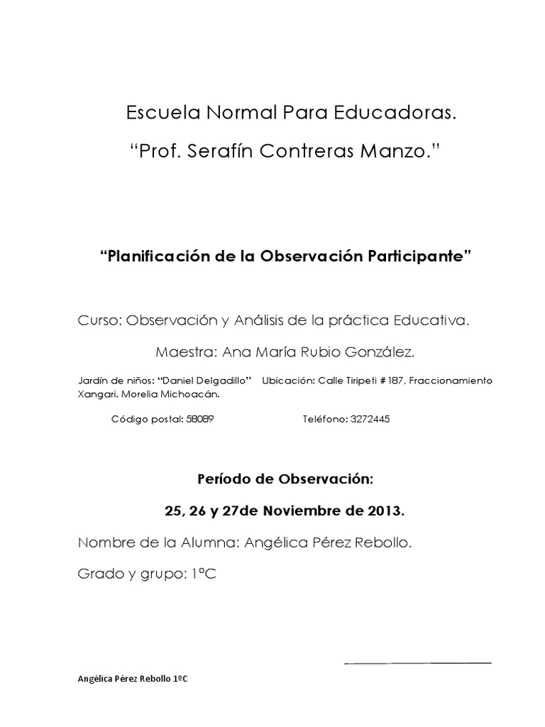 Perodo de Observacin: 25, 26 y 27de Noviembre de 2013. Nombre de la Alumna: Anglica Prez Rebollo. Grado y grupo: 1C
