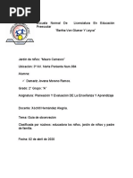 En esta observacin se utilizara el registro descriptivo que son registros diarios, sistematizados y planificados, donde se seala y describe la actuacin del nio y la nia en el desarrollo de las actividades. Esta informacin se vaca en una hoja de observacin, cuaderno, carpeta o ficha destinada para tal fin. Tambin utilizaremos el registro categorial de la informacin que se basa en categoras y se registra en una lista de control, consiste en identificar las conductas, procesos o conocimientos del tema observado. El educador decide con anterioridad de acuerdo a su planificacin, los aspectos a observar.