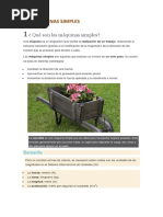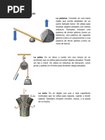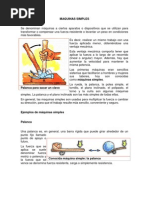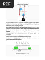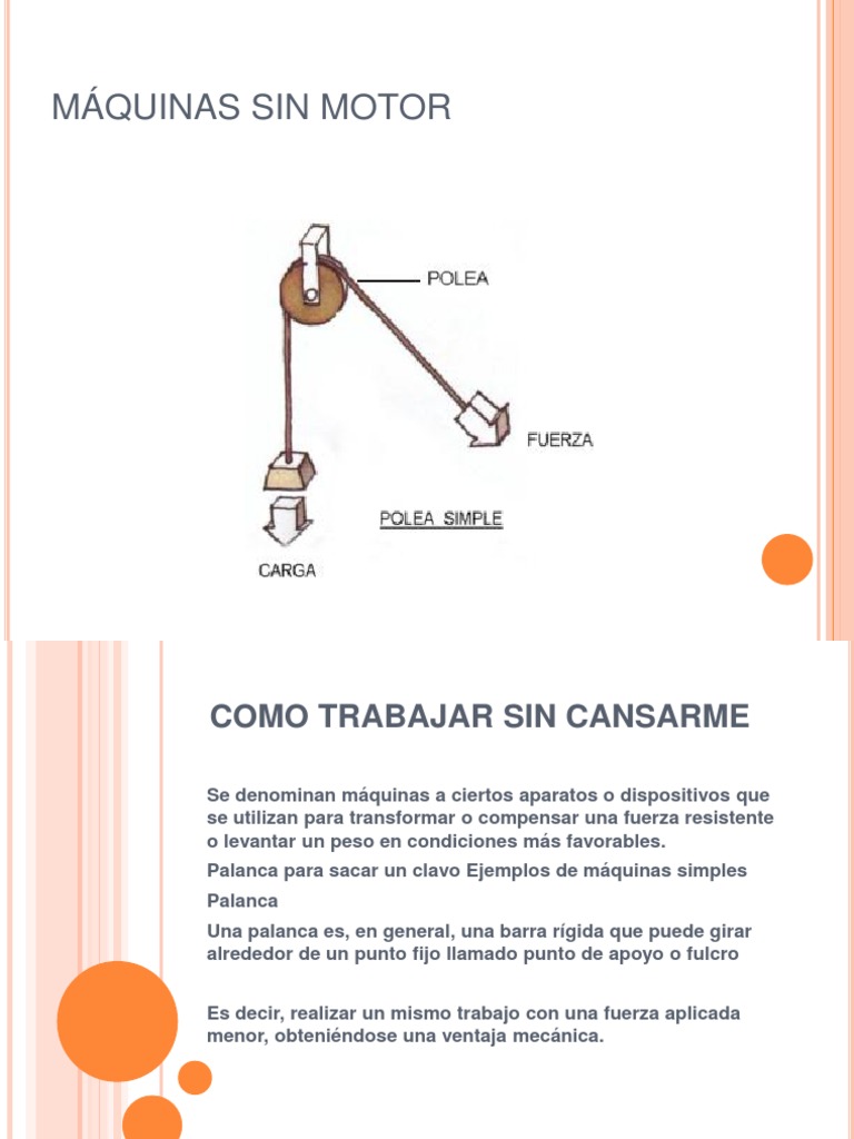 Las primeras mquinas eran sencillos sistemas que facilitaron a hombres y mujeres sus labores, hoy son conocidas como mquinas simples. La rueda, la palanca, la polea simple, el tornillo, el plano inclinado, el polipasto, el torno y la cua son algunas mquinas simples. La palanca y el plano inclinado son las ms simples de todas ellas. Palanca Una palanca es, en general, una barra rgida que puede girar alrededor de un punto fijo llamado punto de apoyo o fulcro. Polea La polea sirve para elevar pesos a una cierta altura. Consiste en una rueda por la que pasa una cuerda a la que en uno de sus extremos se fija una carga, que se eleva aplicando una fuerza al otro extremo. Su funcin es doble, puede disminuir una fuerza, aplicando una menor, o simplemente cambiar la direccin de la fuerza. Si consta de ms de una rueda, la polea amplifica la fuerza. Se usa, por ejemplo, para subir objetos a los edificios o sacar agua de Los pozos.