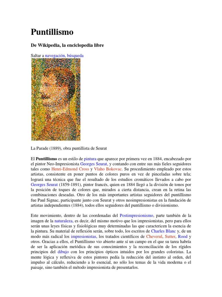La Parade (1889), obra puntillista de Seurat El Puntillismo es un estilo de pintura que aparece por primera vez en 1884, encabezado por el pintor Neo-Impresionista Georges Seurat, y contando con entre sus ms fieles seguidores tales como Henri-Edmond Cross y Vlaho Bokovac. Su procedimiento empleado por estos artistas, consistente en poner puntos de colores puros en vez de pinceladas sobre tela; lograr una tcnica que fue el resultado de los estudios cromticos llevados a cabo por Georges Seurat (1859-1891), pintor francs, quien en 1884 lleg a la divisin de tonos por la posicin de toques de colores que, mirados a cierta distancia, crean en la retina las combinaciones deseadas. Otro de los ms importantes artistas seguidores del puntillismo fue Paul Signac, participante junto con Seurat y otros neoimpresionistas en la fundacin de artistas independientes (1884), todos ellos seguidores del puntillismo o divisionismo. Este movimiento, dentro de las coordenadas del Postimpresionismo, parte tambin de la imagen de la naturaleza, es decir, del mismo motivo que los impresionistas, pero para ellos sern unas leyes fsicas y fisiolgicas muy determinadas las que caractericen la esencia de la pintura. Su material de reflexin sern, sobre todo, los escritos de Charles Blanc y, de un modo ms radical los impresionistas, los tratados cientficos de Cheverul, Sutter, Rood y otros. Gracias a ellos, el Puntillismo vio abierto ante s un campo en el que su tarea habra de ser la aplicacin metdica de sus conocimientos y la reconciliacin de los rgidos principios del dibujo con los principios pticos intuidos por los grandes coloristas. La mente lgica y reflexiva de estos pintores peda la reduccin del instinto al orden, del impulso al clculo, reduciendo a lo esencial, no slo los temas de la vida moderna o el paisaje, sino tambin el mtodo impresionista de presentarlos.