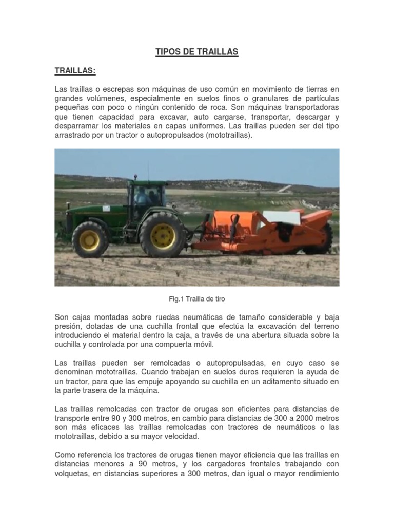 TRAILLAS: Las trallas o escrepas son mquinas de uso comn en movimiento de tierras en grandes volmenes, especialmente en suelos finos o granulares de partculas pequeas con poco o ningn contenido de roca. Son mquinas transportadoras que tienen capacidad para excavar, auto cargarse, transportar, descargar y desparramar los materiales en capas uniformes. Las traillas pueden ser del tipo arrastrado por un tractor o autopropulsados (mototraillas).