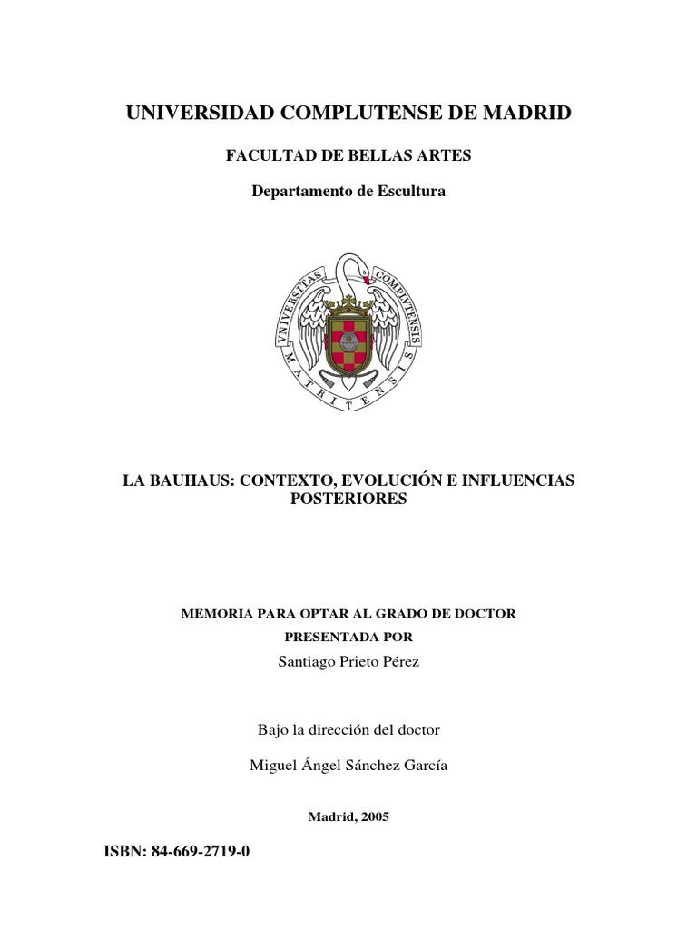 Al recordar a todos aqullos que, de una u otra forma, me han ayudado en estos cuatro aos que he dedicado al estudio de la Bauhaus, slo cumplo con un tan grato como justo deber. As, deseo traer aqu y expresar mi gratitud a cada uno de ellos. - En primer lugar quiero manifestar mi reconocimiento al doctor y profesor D. Miguel ngel Snchez Garca, director de este trabajo, maestro de escultores y profundo conocedor de la evolucin de la escultura europea. Sin su sabio y til consejo esta obra no hubiese sido posible. Siempre me facilit los medios necesarios para mi labor y encontr en l orientacin y aliento. - Al profesor D. Delfn Rodrguez Ruiz, doctor de la Facultad de Historia del Arte de la Universidad Complutense de Madrid, a quien debo el entusiasmo transmitido por la Historia y la Arquitectura del siglo XVIII, fundamental para una adecuada ubicacin y entendimiento del arte y la arquitectura europea posteriores. - Al profesor D. Fausto Blzquez Snchez, por su inestimable ayuda como tutor en la primera etapa de este trabajo y por su atenta disposicin y consejo, sobre todo en el terreno bibliogrfico. - A los doctores D. Julin Gil y D. Almudena Armenta, profesores de la Facultad de Bellas Artes de la Universidad Complutense de Madrid, por su colaboracin, tan valiosa como desinteresada. - A mis amigos Juan Jos Soriano Cea y Antonio Sabador Azorn, por su imprescindible aportacin en el campo informtico. - A mi amigo Fernando Briones, por su colaboracin en la traduccin de textos en alemn. - A Marta Gonzlez Orbegozo, Conservadora Jefe del Departamento de Exposiciones Temporales del Museo Nacional Centro de Arte Reina Sofa, por la atencin prestada y su agradable trato.