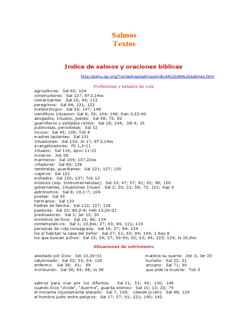 .cci$n de gracias: Sal 66; 67; !2; 107; 124; 136; "or la salvaci$n de &ios: ca (i$ triste,a a 2diversos otivos5Sal 66; 67; !2; 107; 124; 136; acci$n de gracias Sal #5; 103; 116; 11#; 12!; 136; 13#; Eclo 51; <c 1,6#ss ala(an,a: Sal #; 1!; 33; 34; 47; !6'100; 103; 117; 135; 145'150 el culto agrada(le a &ios: Sal 40; 4!; 50; &an 3,2#'43 sal os "enitenciales: Sal 6; 32; 3#; 51; 130; 143; &an 3,26ss; !,4ss; *er 11,23ss; Esd ! la alegr%a del "erd$n de &ios: Sal 32; 51 Momentos en la Vida lecciones del "asado: Sal 7#; 105'107; 114; &t 32; 4s 63,7ss sal os "ara "rocesiones: Sal 42; 47; 4#; 6#; 121; 122; 132 sal os "ara fiestas@religiosidad "o"ular: Sal 24; 47; 50; #1; 14! oraci$n de la a/ana: Sal 5; 57; 10# oraci$n de la noc6e: Sal 4; !1 oraci$n del 8ue no "uede dor ir "or el "eso del dolor: Sal 42; 77; 102