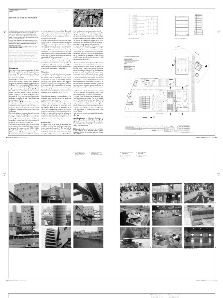 y sntesis dentro de la obra de Lina Bo, donde aparecen claramente los intereses y preocupaciones de la arquitecta. Se trata de una obra tarda en su carrera; parte de lo que podramos llamar un retorno a la arquitectura. El SESC, como centro de ocio, se compone por la asociacin de un bloque de canchas y una piscina distribuidos en cinco pisos, un rea de talleres, una biblioteca, salas de estar y de exposicin, un auditorio, un restaurant y una larga terraza solarium. Podramos decir que el modo de entender el programa arquitectnico en Pompia tiene que ver con una manera de estar en la ciudad y de ocupar los espacios pblicos o colectivos: casi un ejercicio de micro-urbanismo. El proyecto se plantea como agregacin; el contexto se entiende como ruina sobre la cual se interviene. Es lo se llamara una operacin de arquitectura al hacer de un proyecto otro. Dicho de otro modo, se trata de una construccin que se sita entre la intervencin y la invencin. Naturaleza ...no podemos mirar a la naturaleza con otros ojos que los de personas educadas artsticamente. Recurdese, por ejemplo, cmo se describen los Alpes todava en los relatos de viajes del siglo XVIII: montaas terrorficas, cuyo horrible aspecto y cuya espantosa ferocidad eran sentidos como una expulsin de la belleza, de la humanidad, de la tranquilidad de la existencia. Hoy en da, en cambio, todo el mundo est convencido que las grandes formaciones de nuestras cordilleras representan no slo la sublimidad de la naturaleza, sino tambin su belleza ms propia. Hans-Georg Gadamer Est claro que miramos a la naturaleza con ojos educados por el arte. Dicho de otro modo, del mundo vemos lo que sabemos. Dejando a un lado consideraciones banales con respecto a la naturaleza o a lo artificial v/s lo natural, llama la atencin el particular modo de Lina Bo Bardi de ver la naturaleza en el SESC: una naturaleza que participa del proyecto como un material ms. Los reflejos en el agua, la brisa, el ruido del viento en las hojas de los rboles, las vistas del cielo y el movimiento de las nubes desde las perforaciones de los muros, son elementos con los cuales componer. Construccin El proyecto del SESC pone de manifiesto una condicin material que podramos denominar como austeridad expresiva. Por un lado la brevedad en cuanto a los medios, una austeridad material y formal; por otra parte una fuerte expresin plstica, no como un problema formal