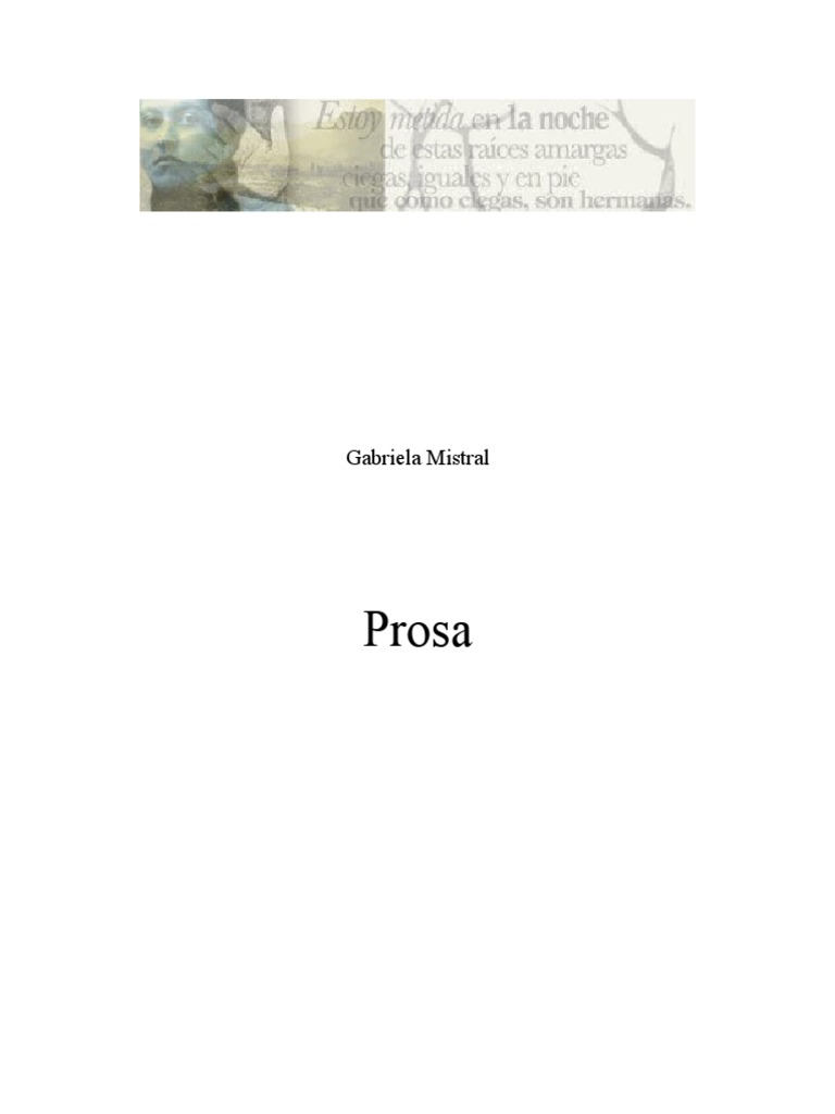 Prosa de Gabriela Mistral ?n hombre de M &ico% Bl"onso .eyes >astilla $l >*ntaro de Greda :nvitacin a la @ectura de .ainer Mara .ilDe Primer .ecuerdo de :sadora )uncan >inco B!os de )estierro de ?namuno Motivos del Mar @engua de Marti Blgo sobre el Pueblo Juechua Plantas de >hile .ecados sobre Michoac*n .ecado de las <oces :n"antiles Invitacin a Gabriela Mistral @a Oracin a la Maestra Grandeza de los Oficios $l Blma en la Brtesana $scultura >hilena% @aura .odig ?na Puerta >olonial 'entido del O"cio Recados para Amrica $l Grito $l 8ipo del :ndio Bmericano @a Bventura de la @engua @a Madre @a Palabra Maldita Recados Contando a Chile Ereve )escripcin de >hile @iteratura >hilena Blgunos >uentistas Menos >ndor y m*s Guemul Pedro Prado% $scritor >hileno Peque!o Mapa Budible de >hile El Otro !icida de Gabriela Mistral 'ue!os de Gabriela Mistral con +in Gabriela Anda por el M!ndo Prologo >hile >oincidencias y )iscidencias entre las Bm ricas ?na )e"inicin% $l Gombre $uropeo $logio de los Pases Peque!os @a $statua de la @ibertad