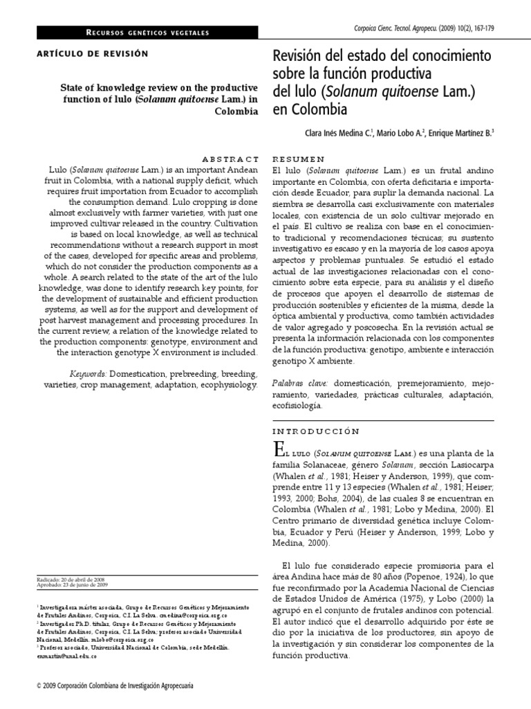 Revisin del estado del conocimiento sobre la funcin productiva del lulo (Solanum quitoense Lam.) en Colombia