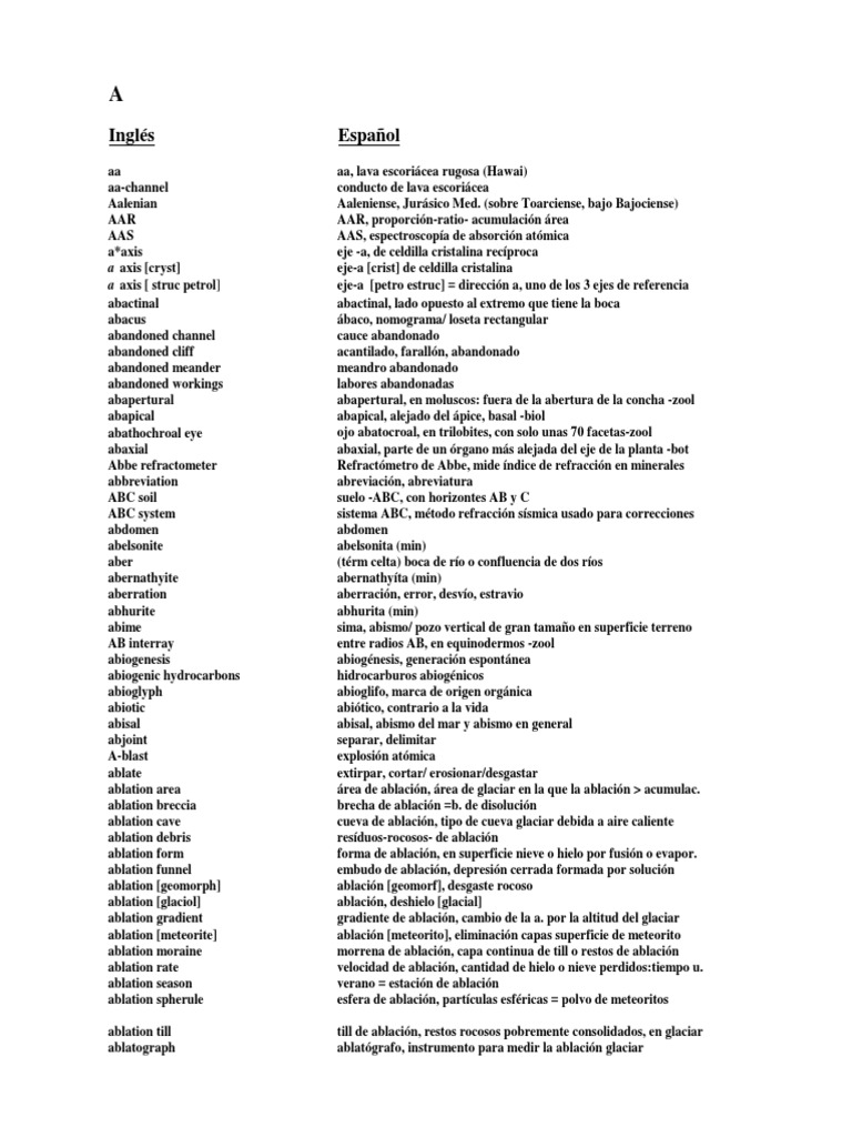 aa, lava escoricea rugosa (Hawai) conducto de lava escoricea Aaleniense, Jursico Med. (sobre Toarciense, bajo Bajociense) AAR, proporcin-ratio- acumulacin rea AAS, espectroscopa de absorcin atmica eje -a, de celdilla cristalina recproca eje-a [crist] de celdilla cristalina eje-a [petro estruc] = direccin a, uno de los 3 ejes de referencia abactinal, lado opuesto al extremo que tiene la boca baco, nomograma/ loseta rectangular cauce abandonado acantilado, faralln, abandonado meandro abandonado labores abandonadas abapertural, en moluscos: fuera de la abertura de la concha -zool abapical, alejado del pice, basal -biol ojo abatocroal, en trilobites, con solo unas 70 facetas-zool abaxial, parte de un rgano ms alejada del eje de la planta -bot Refractmetro de Abbe, mide ndice de refraccin en minerales abreviacin, abreviatura suelo -ABC, con horizontes AB y C sistema ABC, mtodo refraccin ssmica usado para correcciones abdomen abelsonita (min) (trm celta) boca de ro o confluencia de dos ros abernathyta (min) aberracin, error, desvo, estravio abhurita (min) sima, abismo/ pozo vertical de gran tamao en superficie terreno entre radios AB, en equinodermos -zool abiognesis, generacin espontnea hidrocarburos abiognicos abioglifo, marca de origen orgnica abitico, contrario a la vida abisal, abismo del mar y abismo en general separar, delimitar explosin atmica extirpar, cortar/ erosionar/desgastar rea de ablacin, rea de glaciar en la que la ablacin > acumulac. brecha de ablacin =b. de disolucin cueva de ablacin, tipo de cueva glaciar debida a aire caliente resduos-rocosos- de ablacin forma de ablacin, en superficie nieve o hielo por fusin o evapor. embudo de ablacin, depresin cerrada formada por solucin ablacin [geomorf], desgaste rocoso ablacin, deshielo [glacial] gradiente de ablacin, cambio de la a. por la altitud del glaciar ablacin [meteorito], eliminacin capas superficie de meteorito morrena de ablacin, capa continua de till o restos de ablacin velocidad de ablacin, cantidad de hielo o nieve perdidos:tiempo u. verano = estacin de ablacin esfera de ablacin, partculas esfricas = polvo de meteoritos till de ablacin, restos rocosos pobremente consolidados, en glaciar ablatgrafo, instrumento para medir la ablacin glaciar