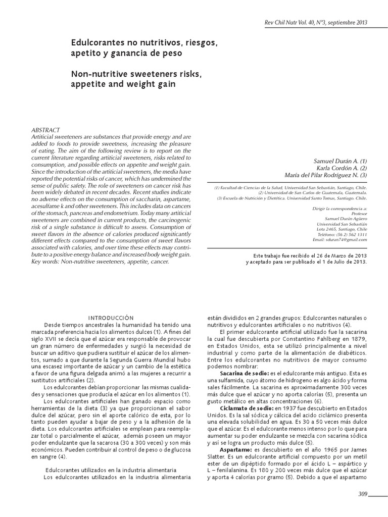Edulcorantes no nutritivos, riesgos, apetito y ganancia de peso Non-nutritive sweeteners risks, appetite and weight gain