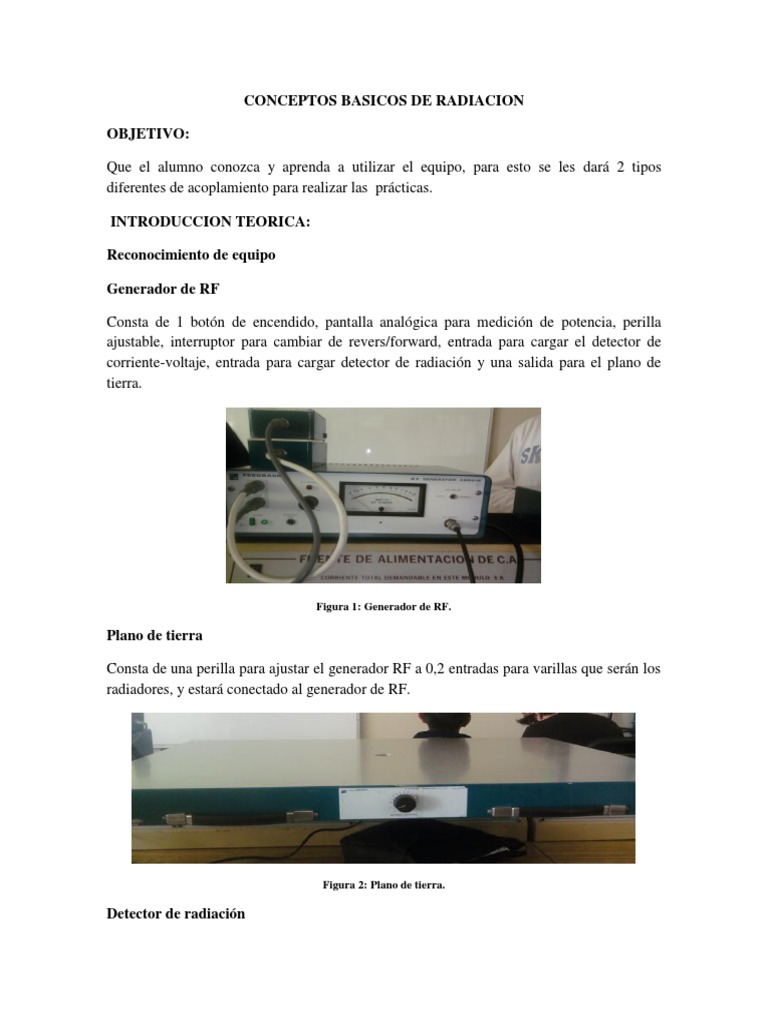 diferentes de acoplamiento para realizar las prcticas. INTRODUCCION TEORICA: Reconocimiento de equipo Generador de RF Consta de 1 botn de encendido, pantalla analgica para medicin de potencia, perilla ajustable, interruptor para cambiar de revers/forward, entrada para cargar el detector de corriente-voltaje, entrada para cargar detector de radiacin y una salida para el plano de tierra.