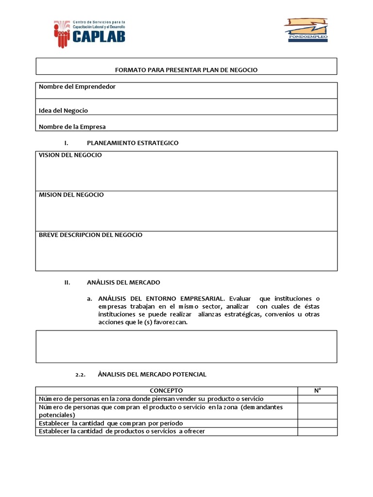 FORMATO PARA PRESENTAR PLAN DE NEGOCIO Nombre del Emprendedor