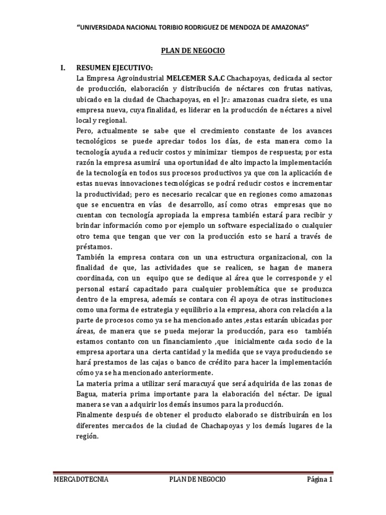PLAN DE NEGOCIO I. RESUMEN EJECUTIVO: La Empresa Agroindustrial MELCEMER S.A.C Chachapoyas, dedicada al sector de produccin, elaboracin y distribucin de nctares con frutas nativas, ubicado en la ciudad de Chachapoyas, en el Jr.: amazonas cuadra siete, es una empresa nueva, cuya finalidad, es liderar en la produccin de nctares a nivel local y regional. Pero, actualmente se sabe que el crecimiento constante de los avances tecnolgicos se puede apreciar todos los das, de esta manera como la tecnologa ayuda a reducir costos y minimizar tiempos de respuesta; por esta razn la empresa asumir una oportunidad de alto impacto la implementacin de la tecnologa en todos sus procesos productivos ya que con la aplicacin de estas nuevas innovaciones tecnolgicas se podr reducir costos e incrementar la productividad; pero es necesario recalcar que en regiones como amazonas que se encuentra en vas de desarrollo, as como otras empresas que no cuentan con tecnologa apropiada la empresa tambin estar para recibir y brindar informacin como por ejemplo un software especializado o cualquier otro tema que tengan que ver con la produccin esto se har a travs de prstamos. Tambin la empresa contara con un una estructura organizacional, con la finalidad de que, las actividades que se realicen, se hagan de manera coordinada, con un equipo que se dedique al rea que le corresponde y el personal estar capacitado para cualquier problemtica que se produzca dentro de la empresa, adems se contara con l apoya de otras instituciones como una forma de estrategia y equilibrio a la empresa, ahora con relacin a la parte de procesos como ya se ha mencionado antes ,estas estarn ubicadas por reas, de manera que se pueda mejorar la produccin, para eso tambin estamos contanto con un financiamiento ,que inicialmente cada socio de la empresa aportara una cierta cantidad y la medida que se vaya produciendo se har prestamos de las cajas o banco de crdito para hacer la implementacin cmo ya se ha mencionado anteriormente. La materia prima a utilizar ser maracuy que ser adquirida de las zonas de Bagua, materia prima importante para la elaboracin del nctar. De igual manera se van a adquirir los dems insumos para la produccin. Finalmente despus de obtener el producto elaborado se distribuirn en los diferentes mercados de la ciudad de Chachapoyas y los dems lugares de la regin.
