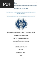 Caractersticas del envase: Reutilizable y reciclable. Inerte e impermeable. Completamente hermtico. Es barrera contra cambios de temperatura. Permite larga vida. Lugar de fabricacin, distribucin, direccin, telfono: Lugar de fabricacin: laboratorio de tecnologa UNTRM Distribucin: mercados, bodegas y centros comerciales a nivel local y regional. Direccin: Jr. amazonas cuadra siete. Telfono: cel.: 957915809 rpm: #953944715 Registro y permisos legales: Se implementara, debido a que la empresa est en una etapa de formacin, pero si contara con todo los requisitos que debe tener toda empresa a medida que se vaya consolidando y sea una empresa ejemplo de otras empresas similares. Para ello se trabajara en equipo a nivel de empresa y nos esforzaremos por lograr el objetivo de ser una empresa competitiva y lder. Certificacin de calidad: El nctar, como todo alimento para consumo humano, debe ser elaborado con las mximas medidas de higiene que aseguren la calidad y no ponga en riesgo, la salud de quienes lo consumen. Por lo tanto debe elaborarse en buenas condiciones de sanidad, con frutas maduras, frescas, limpias y libres de restos de sustancias txicas. Puede prepararse con pulpas concentradas o con frutas previamente elaboradas o conservadas, siempre que renan los requisitos mencionados. En general, los requisitos de un nctar se pueden resumir de la siguiente manera: - Slidos solubles por lectura (Brix) a 20C: Mnimo 12%, Mximo 18%. - pH: 3.5 4.0 - Acidez titulable (expresada en cido ctrico anhidro g/100cm3): Mximo 0.6, Mnimo 0.4. - Relacin entre slidos solubles / acidez titulable: 30 70. - Slidos en suspensin en %(V/V): 18. - Contenido de alcohol etlico en %(V/V) a 15 C/15C: Mximo 0.5.