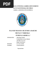 Cuy empresa estar integrado por los siguientes propietarios: Ramos Guelac Herne Mergildo Samame Becerra Merly Poquioma cruz celestino 1.1 La funcin administrativa: Gestin y produccin el control de calidad del producto. Acopio de frutas y seleccin de frutas de maracuy. Administracin y comercializacin del producto final. II. DESCRIPCIN DEL NEGOCIO: La empresa se dedicar netamente a la produccin de nctar de maracuy, cuyas fruta se desarrollan en las zonas de clima clidos de la regin amazonas especficamente en Bagua, la peca, Pedro Ruz y otros. La obtencin del jugo se har de forma industrial, con el fin de obtener un producto de buena calidad, pasando por diferentes procesos hasta obtener el producto, luego se har el envasado en botellas de vidrio de 250 ml, despus los productos ya envasados sern distribuidos en los diferentes punto de mercado en Chachapoyas y dems ciudades de la regin. La empresa est optando por la elaboracin de nctar de maracuy, por la demanda insatisfecha de nctares que existe, tanto a nivel local como a nivel regional, esto se debe al constante crecimiento poblacional. Adems la empresa contara con una tecnologa apropiada para la produccin de nctar a partir de fruta nativa de la regin La empresa estar dirigida por profesionales calificados para desempear adecuadamente sus funciones. Contaremos con un gerente que se encargar de dirigir la empresa de manera gerencial, para convertir a la empresa, en una empresa lder en su lnea de produccin y comercializacin. Un jefe de produccin, se encargar del rea de produccin de la empresa; ser capaz de optimizar los factores productivos, utilizando la ecuacin de la tcnica y el principio econmico de manera racional. Un jefe de control de calidad, se encargar de evaluar la calidad del producto de materia prima, insumos y producto terminado, para fidelizar a los proveedores y a los clientes en el corto plazo. Los operarios, constituyen la mano de obra directa en el proceso de produccin del nctar de frutas nativas. Un jefe de ventas, encargado de realizar y pronosticar los volmenes de ventas acorde con las necesidades del mercado. Tambin se tendr el apoyo de un asistente de ventas y personal de apoyo.