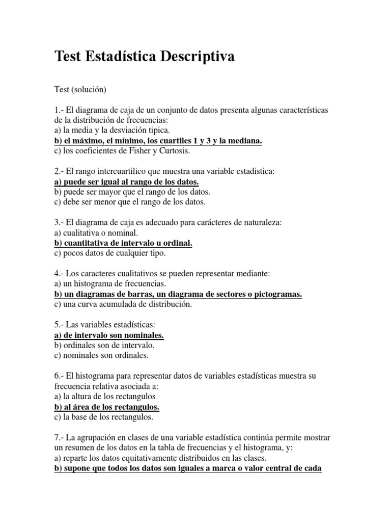 Test (solucin) 1.- El diagrama de caja de un conjunto de datos presenta algunas caractersticas de la distribucin de frecuencias: a) la media y la desviacin tipica. b) el mximo, el mnimo, los cuartiles 1 y 3 y la mediana. c) los coeficientes de Fisher y Curtosis. 2.- El rango intercuartilico que muestra una variable estadistica: a) puede ser igual al rango de los datos. b) puede ser mayor que el rango de los datos. c) debe ser menor que el rango de los datos. 3.- El diagrama de caja es adecuado para carcteres de naturaleza: a) cualitativa o nominal. b) cuantitativa de intervalo u ordinal. c) pocos datos de cualquier tipo. 4.- Los caracteres cualitativos se pueden representar mediante: a) un histograma de frecuencias. b) un diagramas de barras, un diagrama de sectores o pictogramas. c) una curva acumulada de distribucin. 5.- Las variables estadsticas: a) de intervalo son nominales. b) ordinales son de intervalo. c) nominales son ordinales. 6.- El histograma para representar datos de variables estadsticas muestra su frecuencia relativa asociada a: a) la altura de los rectangulos b) al rea de los rectangulos. c) la base de los rectangulos. 7.- La agrupacin en clases de una variable estadstica contina permite mostrar un resumen de los datos en la tabla de frecuencias y el histograma, y: a) reparte los datos equitativamente distribuidos en las clases. b) supone que todos los datos son iguales a marca o valor central de cada
