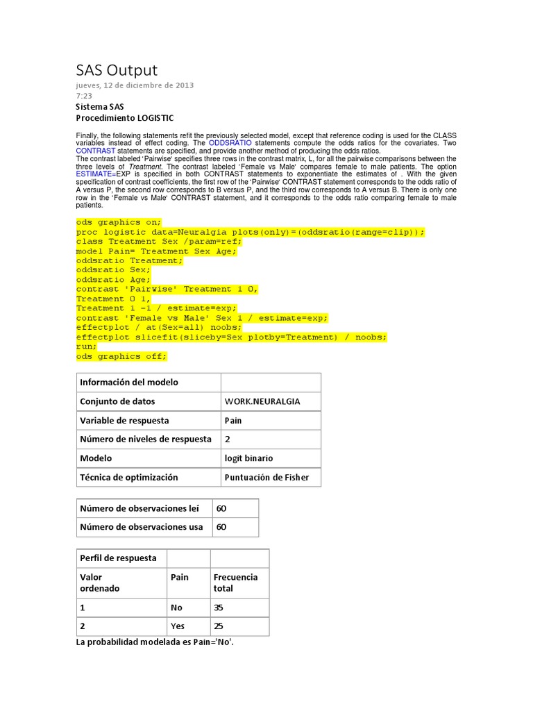 Información del modelo Conjunto de datos Variable de respuesta Número de niveles de respuesta Modelo Técnica de optimización Número de observaciones leí Número de observaciones usa Perfil de respuesta Valor ordenado 1 2 Pain No Yes Frecuencia total 35 25 WORK.NEURALGIA Pain 2 logit binario Puntuación de Fisher 60 60