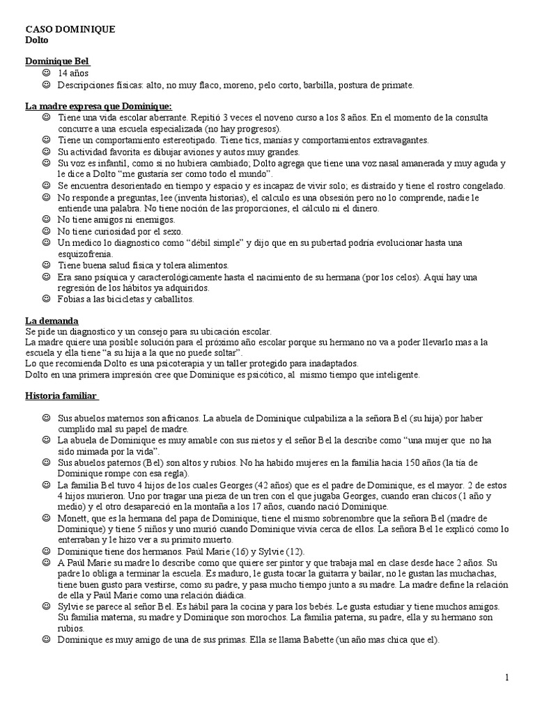 a, postura de primate. La madre expresa que Dominique: Tiene una vida escolar aberrante. Repiti 3 veces el noveno curso a los aos. !n el momento de la consulta concurre a una escuela especiali"ada #no $ay pro%resos&. Tiene un comportamiento estereotipado. Tiene tics, manas y comportamientos e'trava%antes. (u actividad favorita es dibu)ar aviones y autos muy %randes. (u vo" es infantil, como si no $ubiera cambiado* Dolto a%re%a +ue tiene una vo" nasal amanerada y muy a%uda y le dice a Dolto ,me %ustara ser como todo el mundo-. (e encuentra desorientado en tiempo y espacio y es incapa" de vivir solo* es distrado y tiene el rostro con%elado. .o responde a pre%untas, lee #inventa $istorias&, el calculo es una obsesin pero no lo comprende, nadie le entiende una palabra. .o tiene nocin de las proporciones, el c/lculo ni el dinero. .o tiene ami%os ni enemi%os. .o tiene curiosidad por el se'o. 0n medico lo dia%nostico como ,d1bil simple- y di)o +ue en su pubertad podra evolucionar $asta una es+ui"ofrenia. Tiene buena salud fsica y tolera alimentos. !ra sano ps+uica y caracterol%icamente $asta el nacimiento de su $ermana #por los celos&. 2+u $ay una re%resin de los $/bitos ya ad+uiridos. 3obias a las bicicletas y caballitos. La demanda (e pide un dia%nostico y un conse)o para su ubicacin escolar. 4a madre +uiere una posible solucin para el pr'imo ao escolar por+ue su $ermano no va a poder llevarlo mas a la escuela y ella tiene ,a su $i)a a la +ue no puede soltar-. 4o +ue recomienda Dolto es una psicoterapia y un taller prote%ido para inadaptados. Dolto en una primera impresin cree +ue Domini+ue es psictico, al mismo tiempo +ue inteli%ente. Historia amiliar (us abuelos maternos son africanos. 4a abuela de Domini+ue culpabili"a a la seora 5el #su $i)a& por $aber cumplido mal su papel de madre. 4a abuela de Domini+ue es muy amable con sus nietos y el seor 5el la describe como ,una mu)er +ue no $a sido mimada por la vida-. (us abuelos paternos #5el& son altos y rubios. .o $a $abido mu)eres en la familia $acia 167 aos #la ta de Domini+ue rompe con esa re%la&. 4a familia 5el tuvo 4 $i)os de los cuales 8eor%es #49 aos& +ue es el padre de Domini+ue, es el mayor. 9 de estos 4 $i)os murieron. 0no por tra%ar una pie"a de un tren con el +ue )u%aba 8eor%es, cuando eran c$icos #1 ao y medio& y el otro desapareci en la montaa a los 1: aos, cuando naci Domini+ue. ;onett, +ue es la $ermana del papa de Domini+ue, tiene el mismo sobrenombre +ue la seora 5el #madre de Domini+ue& y tiene 6 nios y uno muri cuando Domini+ue viva cerca de ellos. 4a seora 5el le e'plic como lo enterraban y le $i"o ver a su primito muerto. Domini+ue tiene dos $ermanos. <a=l ;arie #1>& y (ylvie #19&. 2 <a=l ;arie su madre lo describe como +ue +uiere ser pintor y +ue traba)a mal en clase desde $ace 9 aos. (u padre lo obli%a a terminar la escuela. !s maduro, le %usta tocar la %uitarra y bailar, no le %ustan las muc$ac$as, tiene buen %usto para vestirse, como su padre, y pasa muc$o tiempo )unto a su madre. 4a madre define la relacin de ella y <a=l ;arie como una relacin di/dica. (ylvie se parece al seor 5el. !s $/bil para la cocina y para los beb1s. 4e %usta estudiar y tiene muc$os ami%os. (u familia materna, su madre y Domini+ue son moroc$os. 4a familia paterna, su padre, ella y su $ermano son rubios. Domini+ue es muy ami%o de una de sus primas. !lla se llama 5abette #un ao mas c$ica +ue el&.